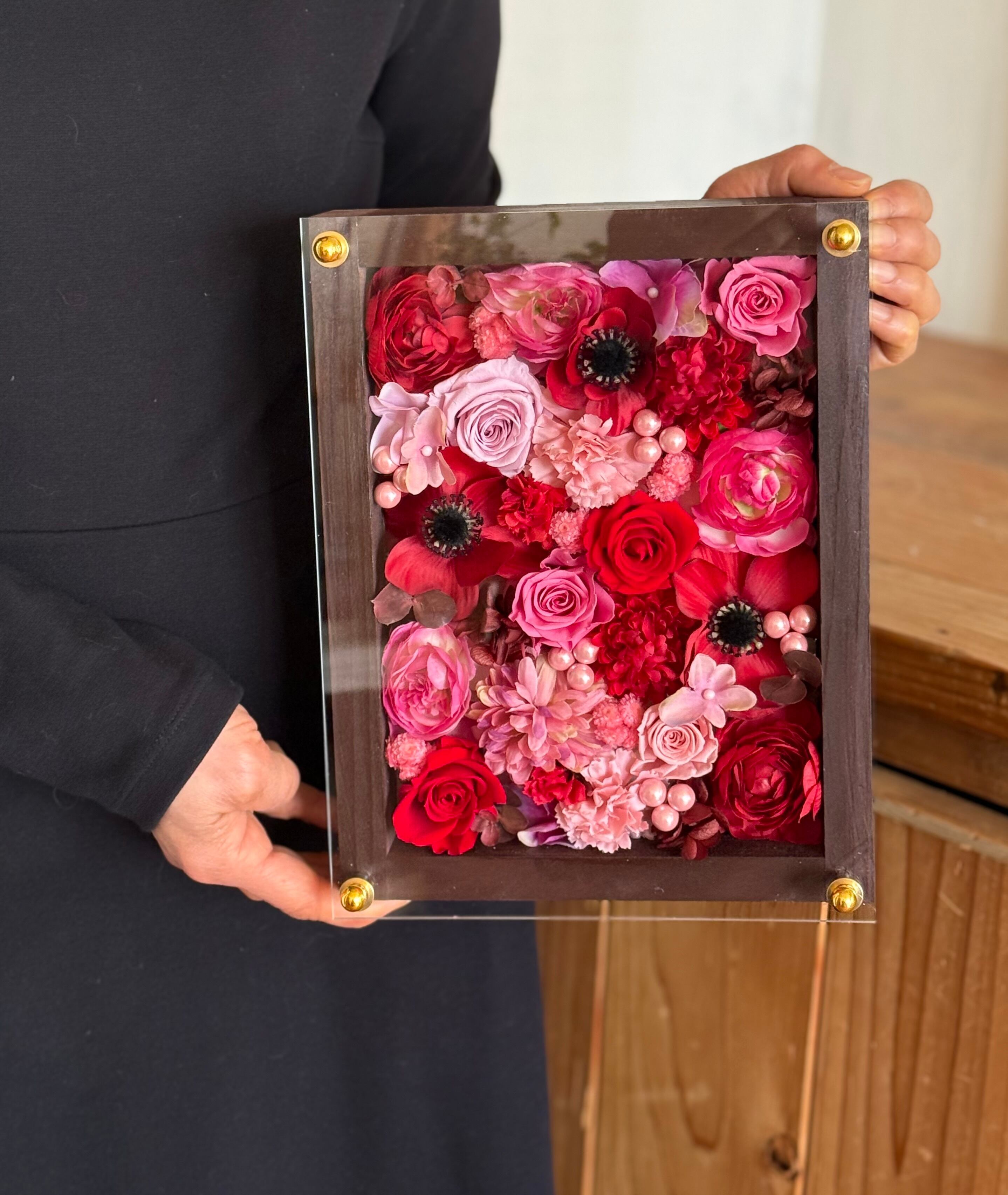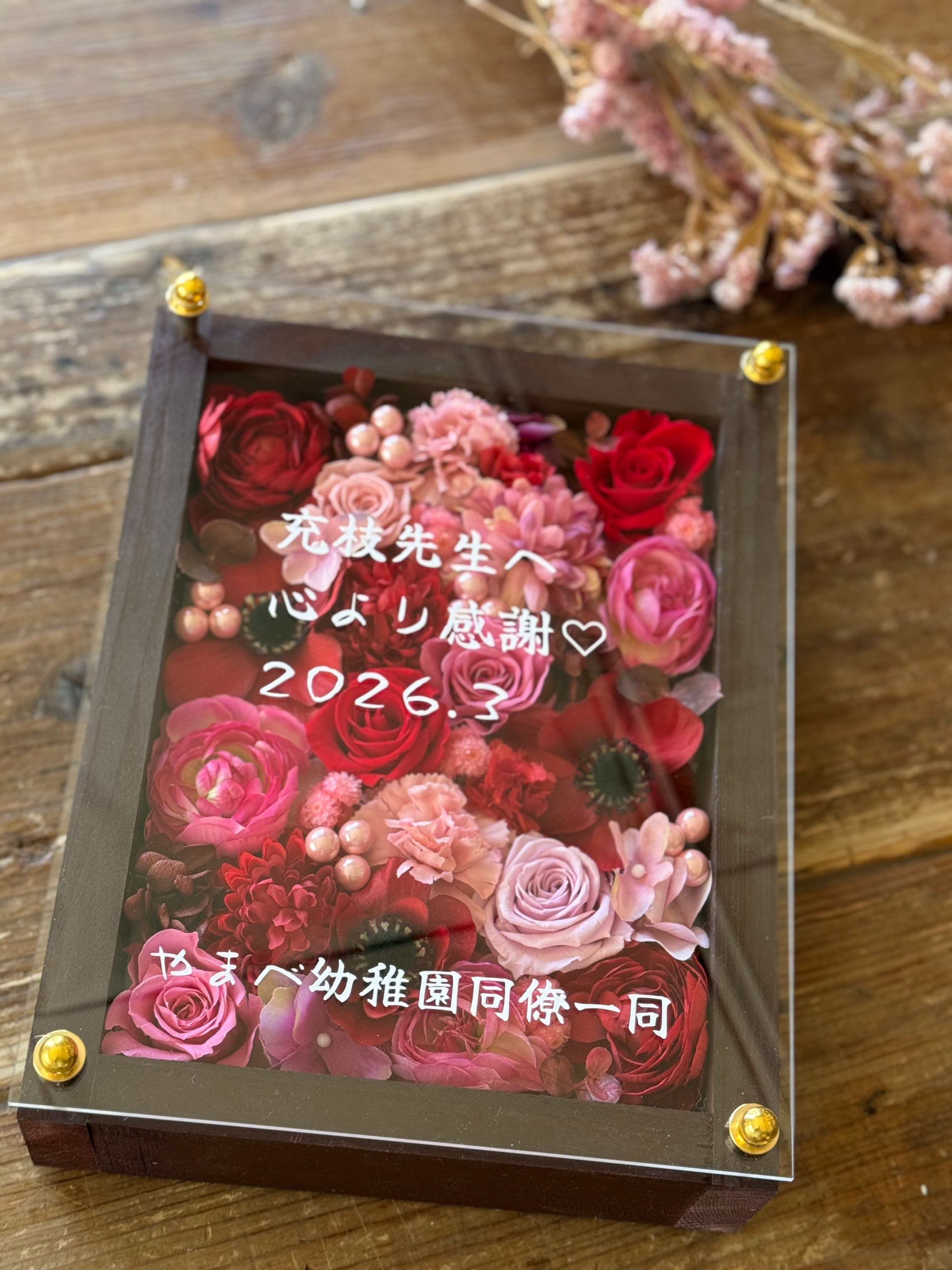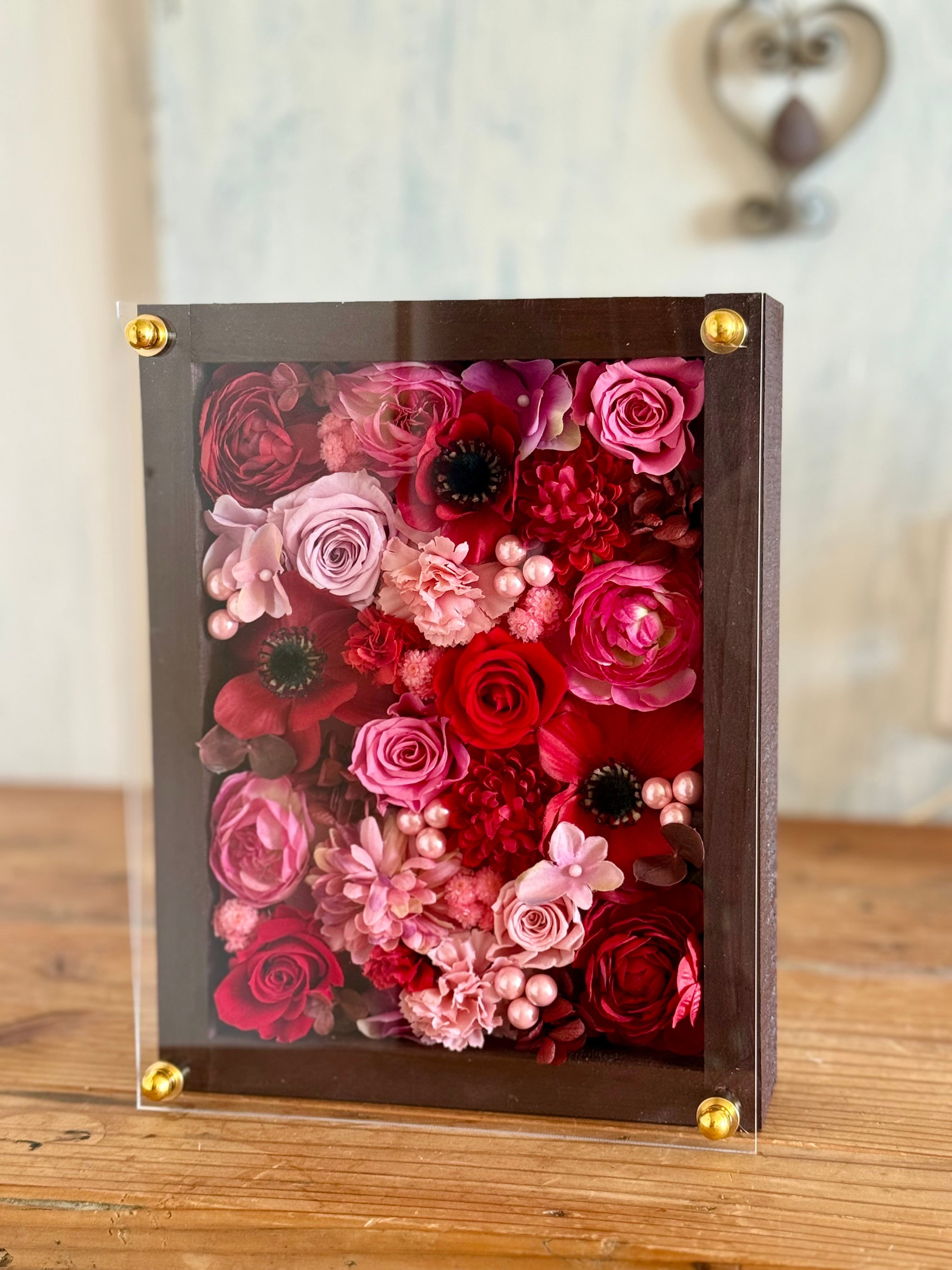 茶色のウッドフレームにプリザーブドフラワーと造花をぎっしり詰め込みアクリル板にはカッティングシートでメッセージをお入れします。