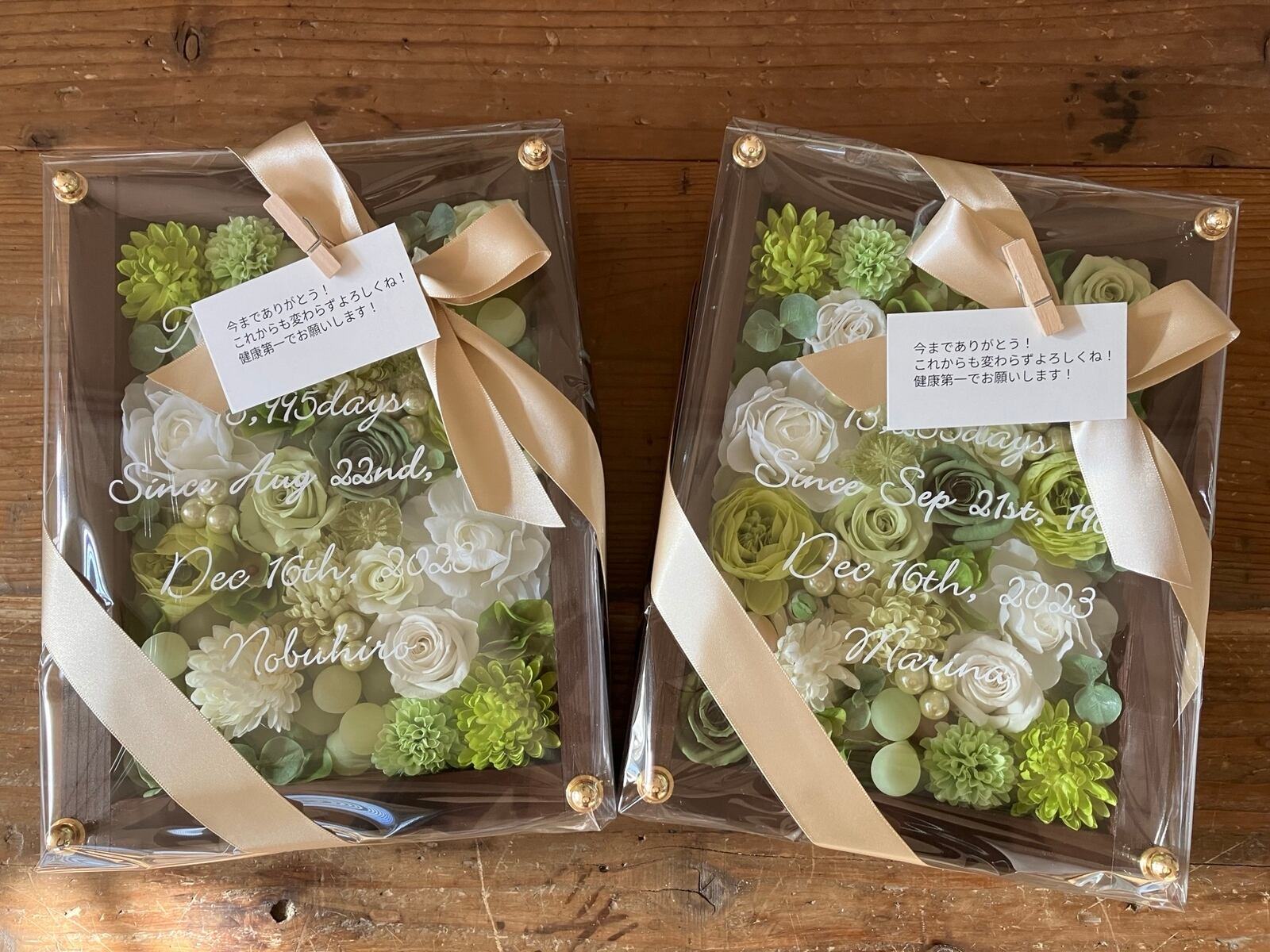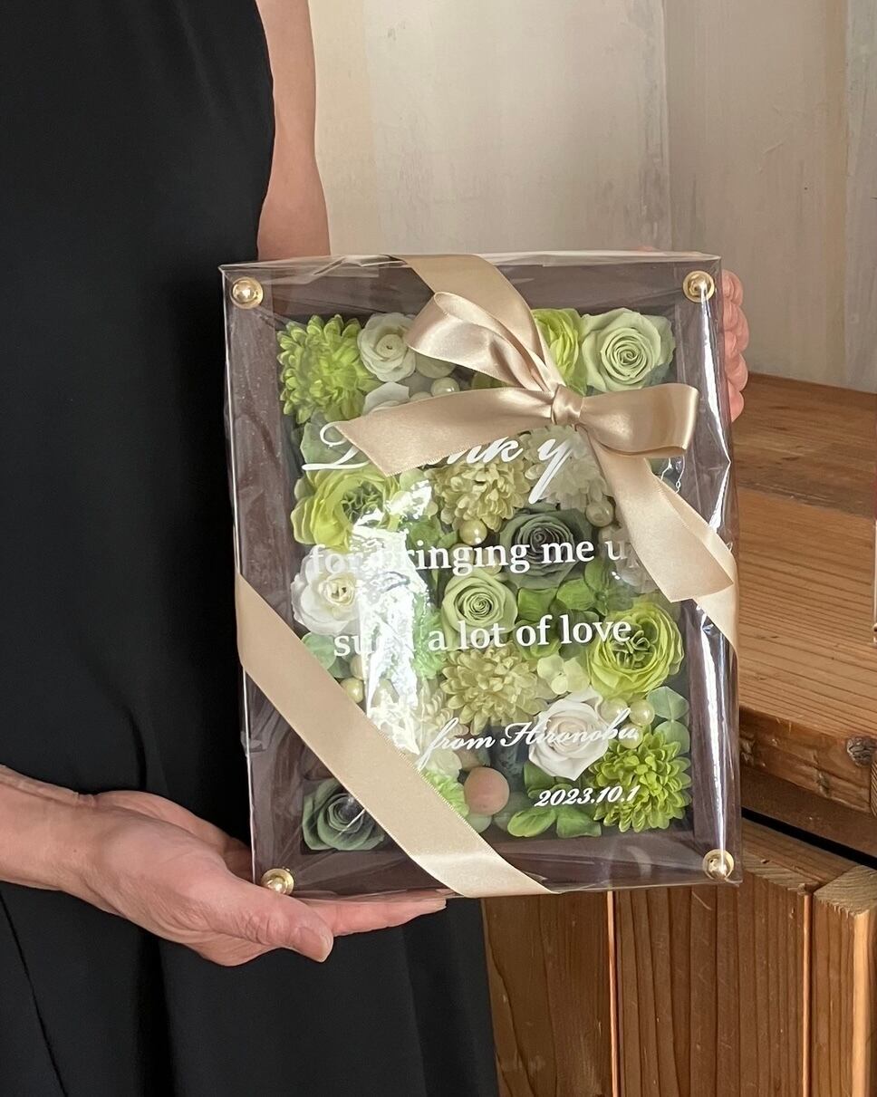 子育て感謝状・両親贈呈品 2個セット【名入れ】 プリザーブドフラワーアレンジ ウッドフレーム 茶木枠〈白グリーンペア〉結婚式 ギフト