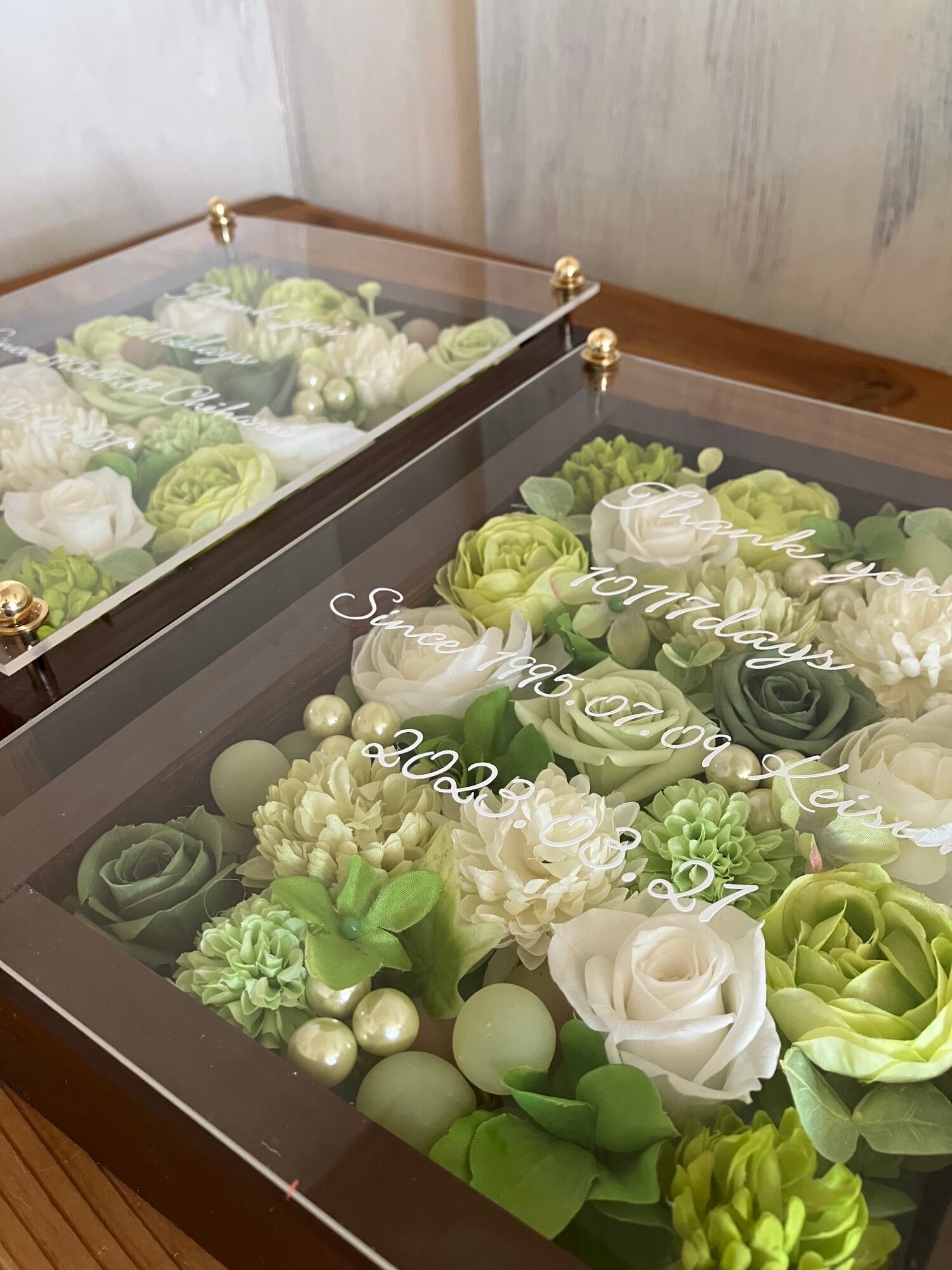 茶色のウッドフレームにプリザーブドフラワーと造花をぎっしり詰め込みアクリル板にはカッティングシートでお名前、挙式日、生まれてから今日までの日数などをお入れします
