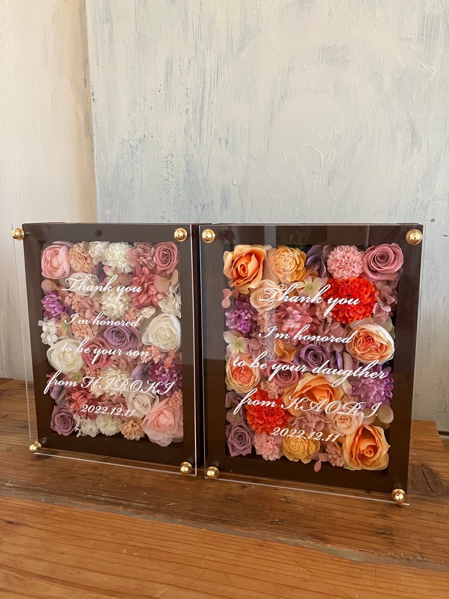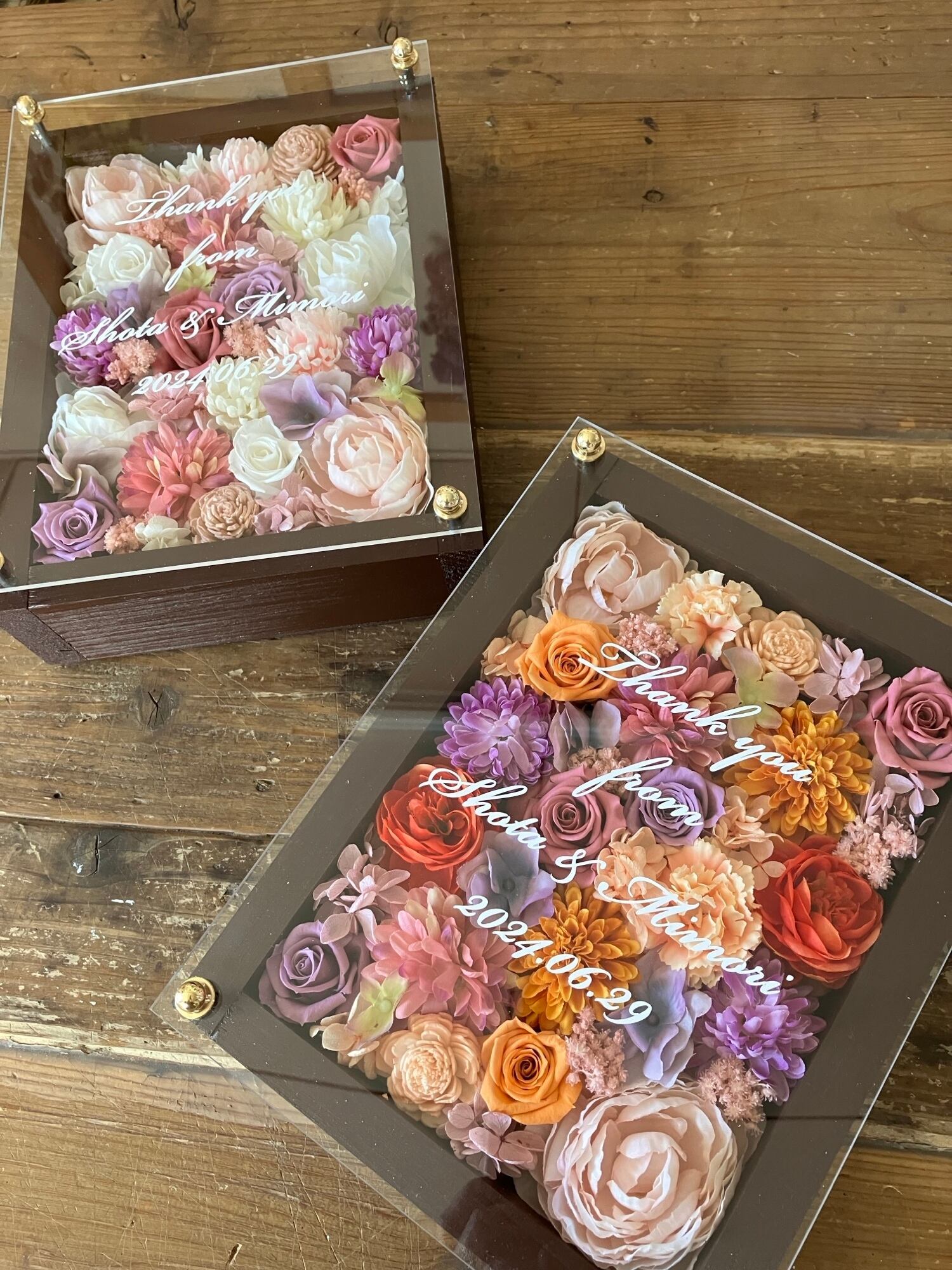 子育て感謝状・両親贈呈品 2個セット【名入れ】プリザーブドフラワーアレンジ ウッドフレーム 茶木枠〈パープルピンクオレンジ&パープルピンク白〉結婚式 ギフト