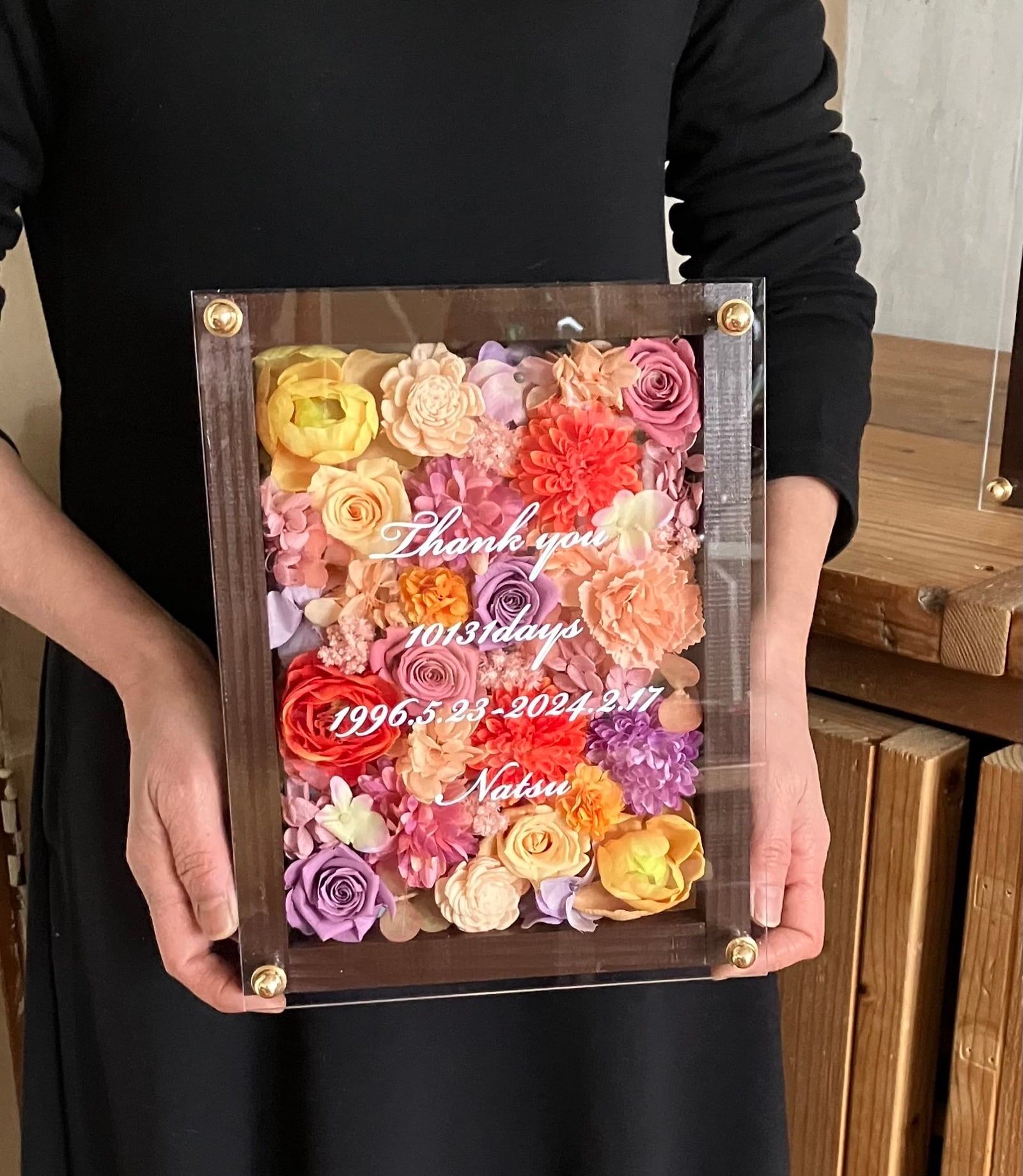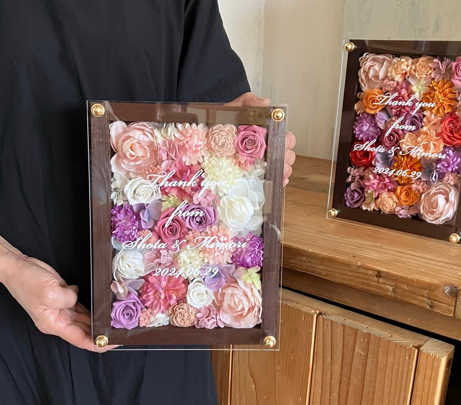 茶色のウッドフレームにプリザーブドフラワーと造花をぎっしり詰め込みアクリル板にはカッティングシートでお名前、挙式日、生まれてから今日までの日数などをお入れします
