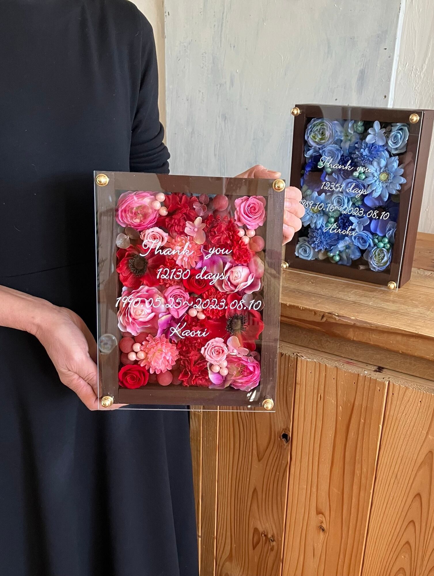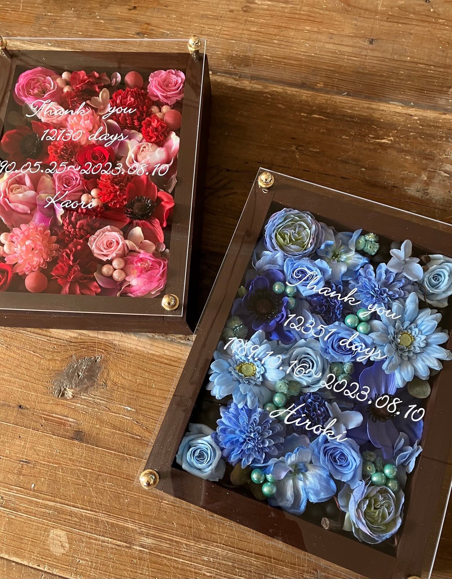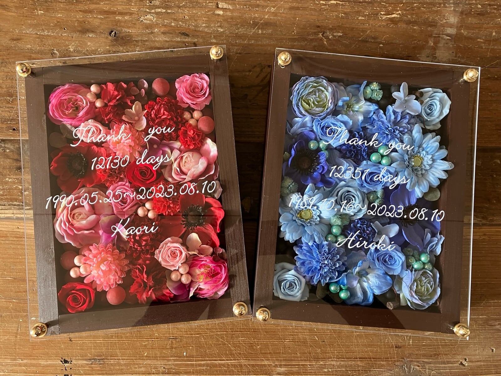 子育て感謝状・両親贈呈品 2個セット【名入れ】プリザーブドフラワーアレンジ ウッドフレーム 木枠〈ブルー&赤ピンク〉結婚式 ギフト