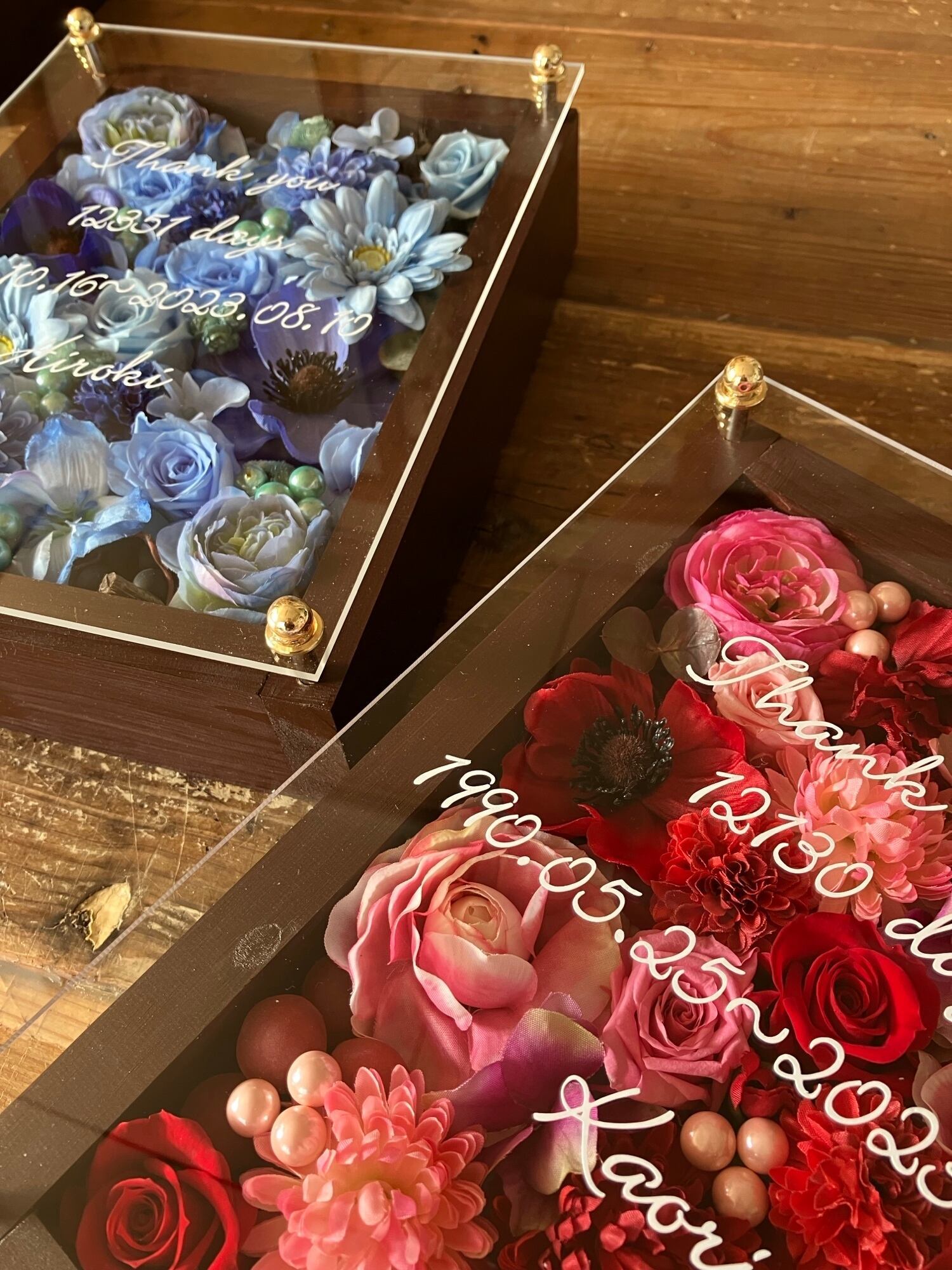 ウッドフレームにプリザーブドフラワーと造花をぎっしり詰め込みアクリル板にはカッティングシートでお名前、挙式日、生まれてから今日までの日数などをお入れします