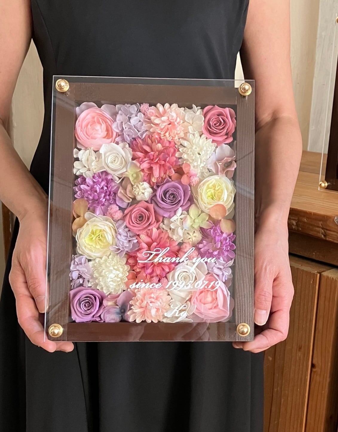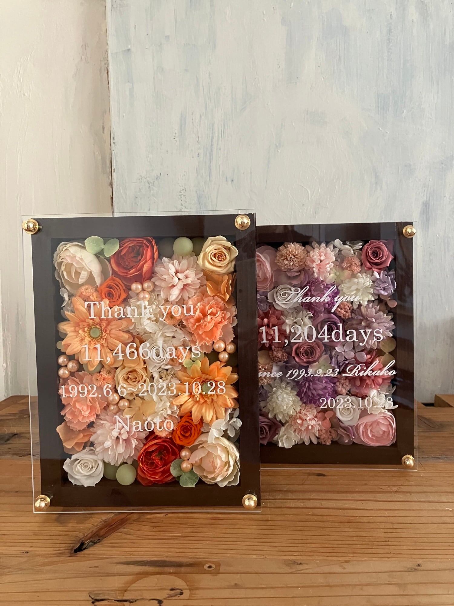 茶色のウッドフレームにプリザーブドフラワーと造花をぎっしり詰め込みアクリル板にはカッティングシートでお名前、挙式日、生まれてから今日までの日数などをお入れします