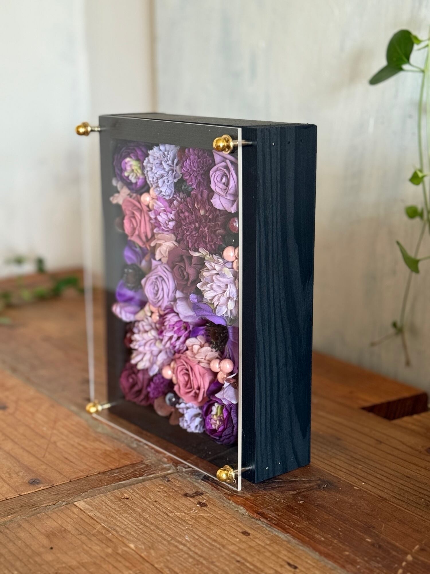 黒色のウッドフレームにプリザーブドフラワーと造花をぎっしり詰め込みアクリル板にはカッティングシートでメッセージをお入れします