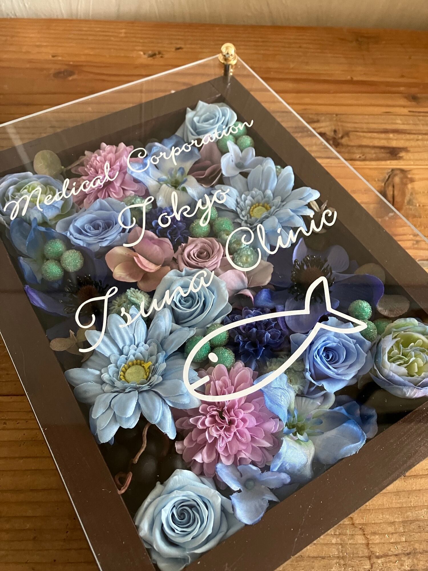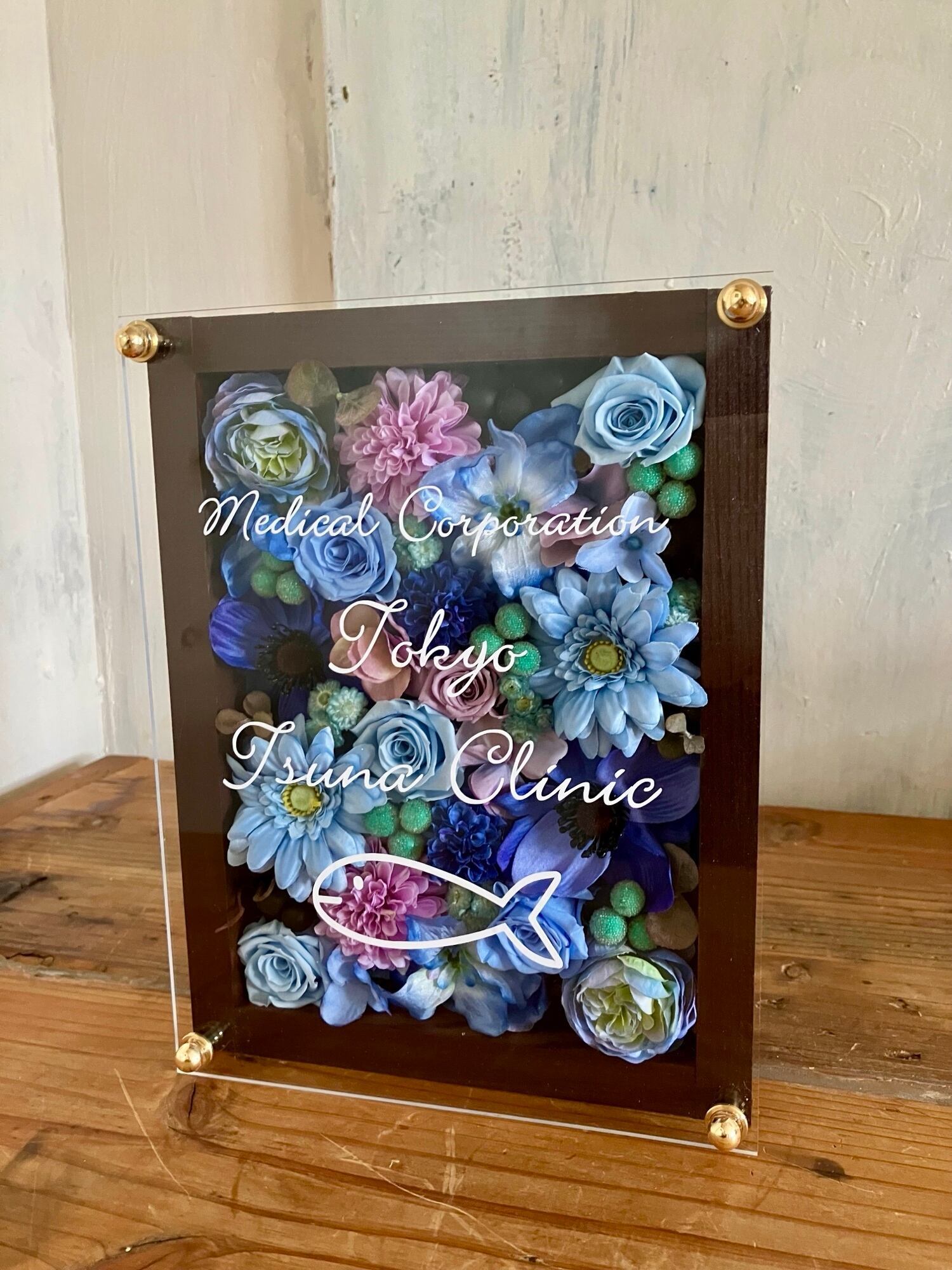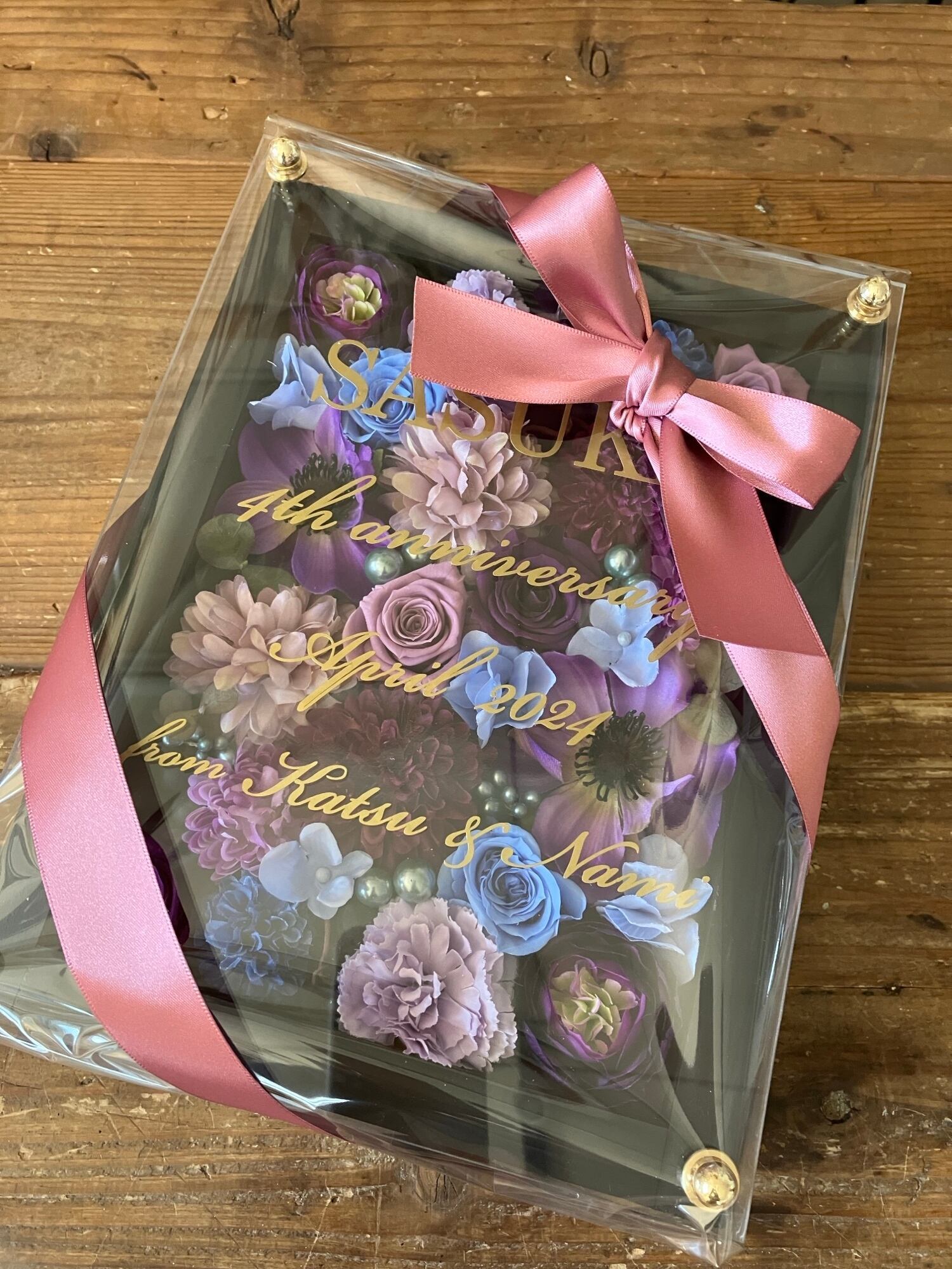 黒色のウッドフレームにプリザーブドフラワーと造花をぎっしり詰め込みアクリル板にはカッティングシートでメッセージをお入れします。
