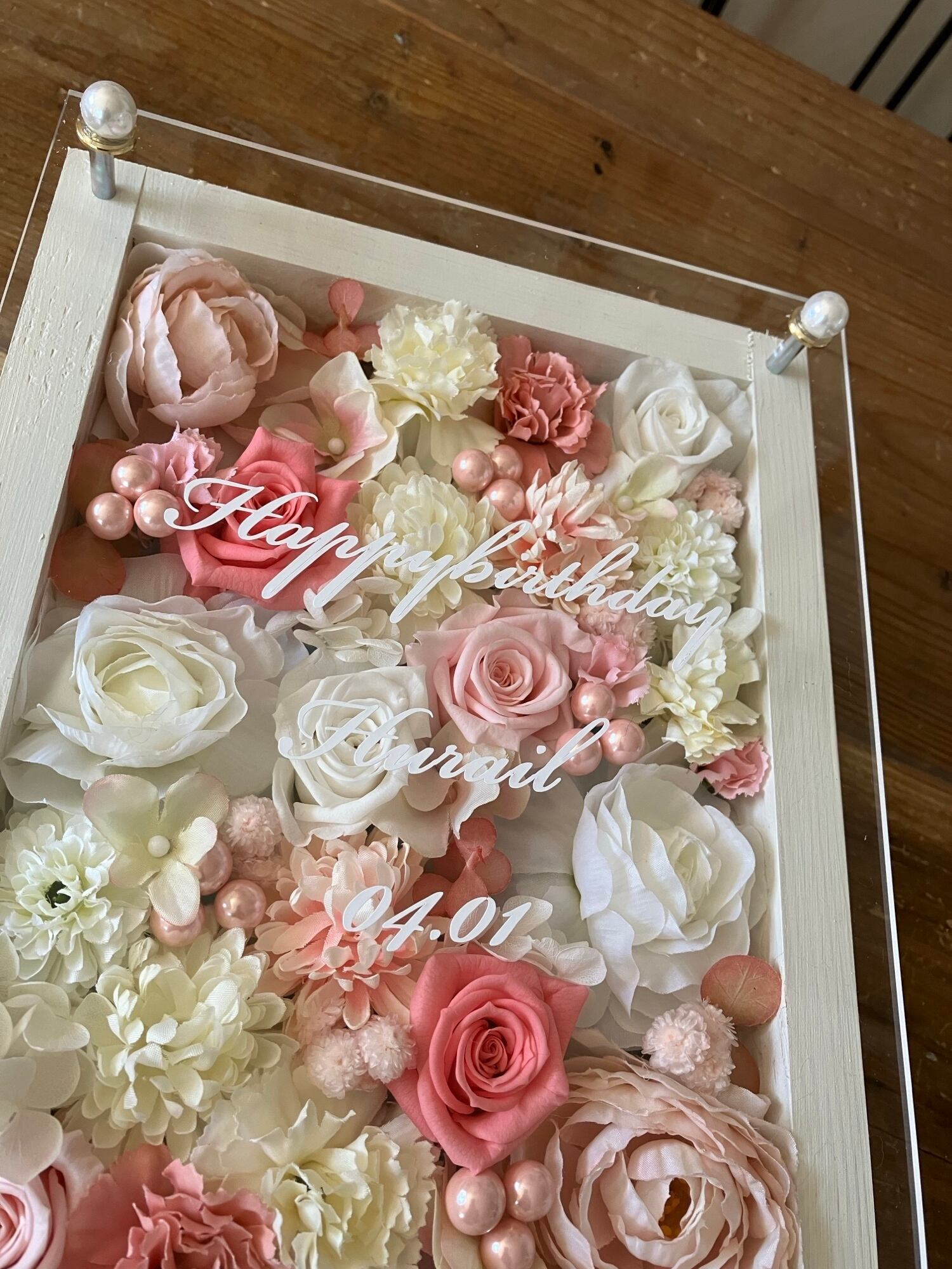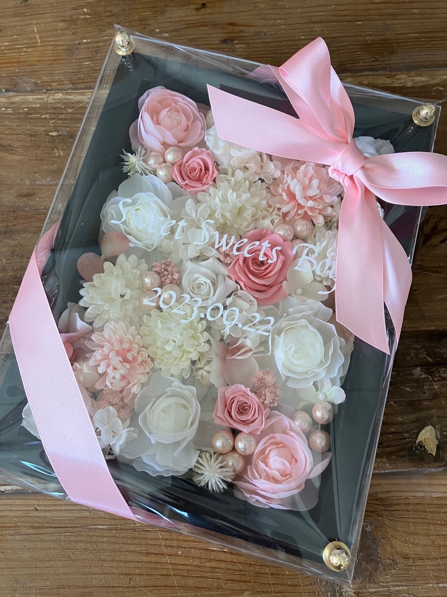 ウッドフレームにプリザーブドフラワーと造花をぎっしり詰め込みアクリル板にはカッティングシートでメッセージをお入れします。