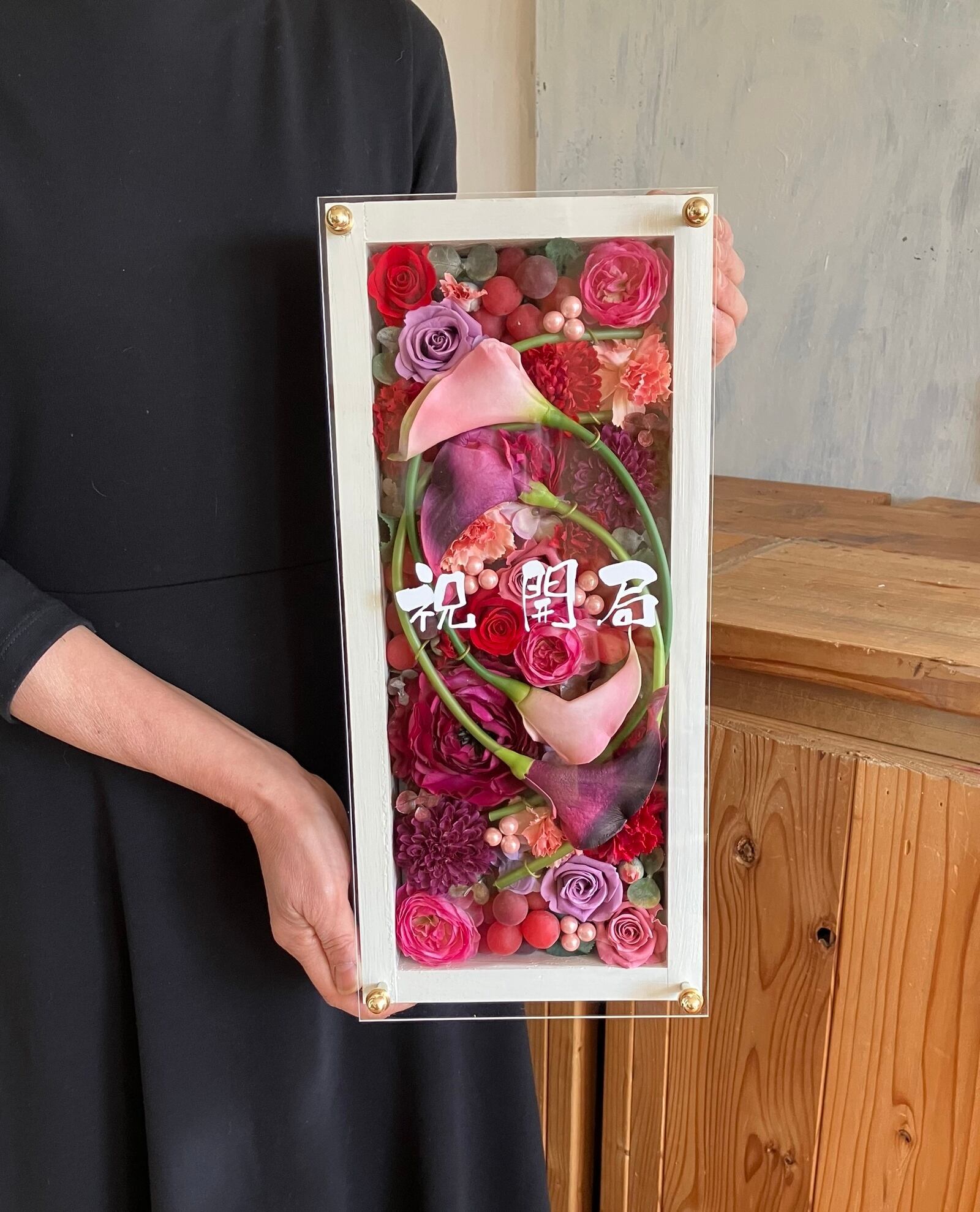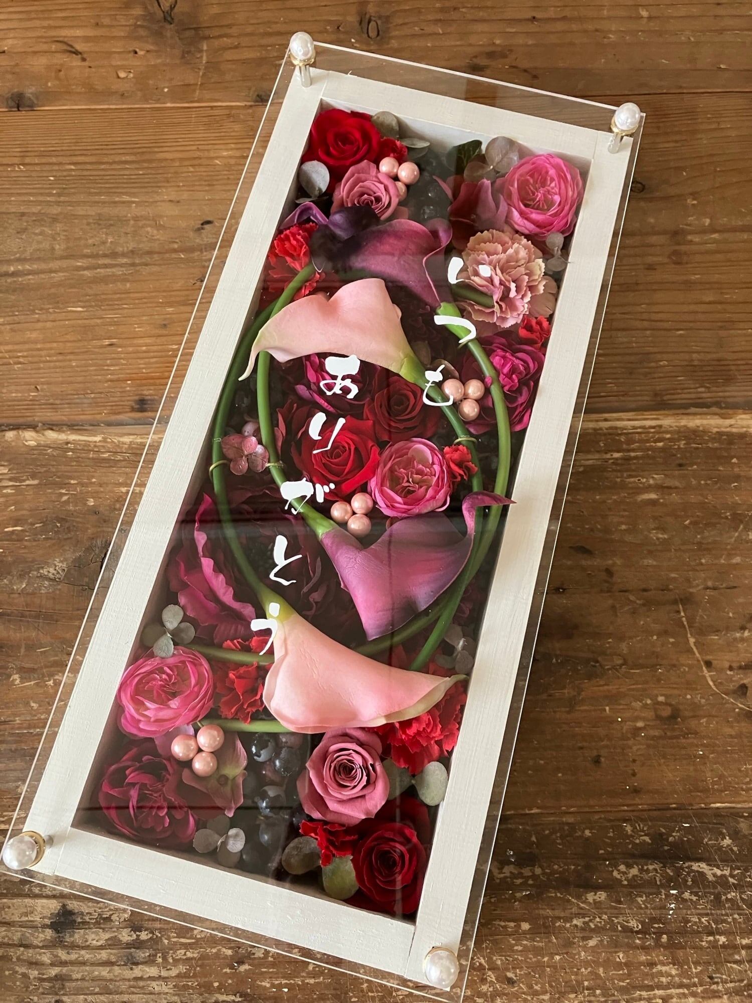 白色のロングサイズのウッドフレームにプリザーブドフラワーと造花をぎっしり詰め込みアクリル板にはカッティングシートでメッセージをお入れします