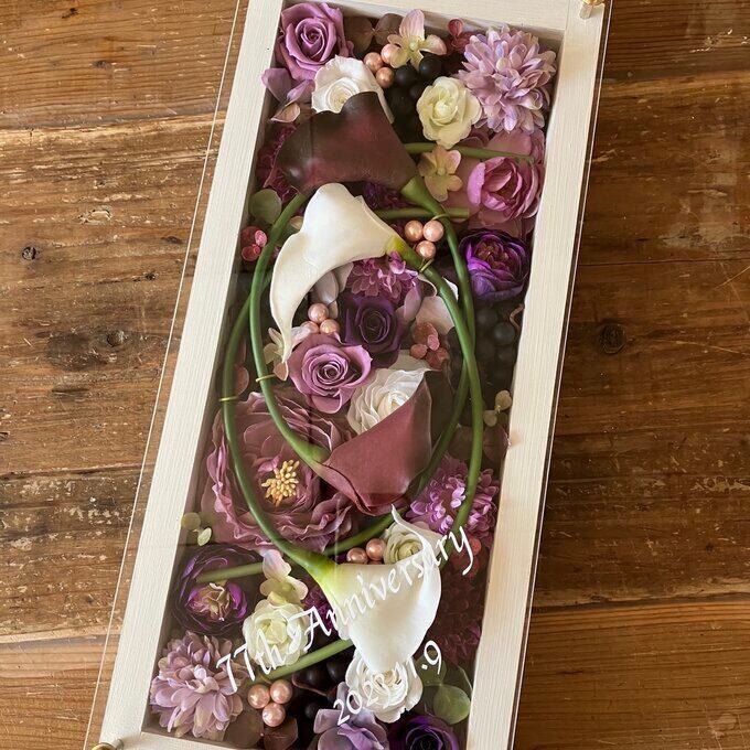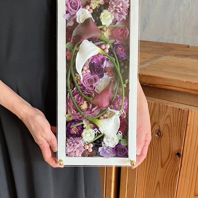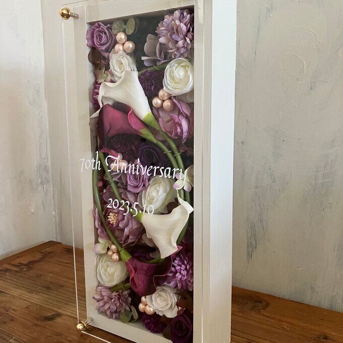 白色のロングサイズのウッドフレームにプリザーブドフラワーと造花をぎっしり詰め込みアクリル板にはカッティングシートでメッセージをお入れします。