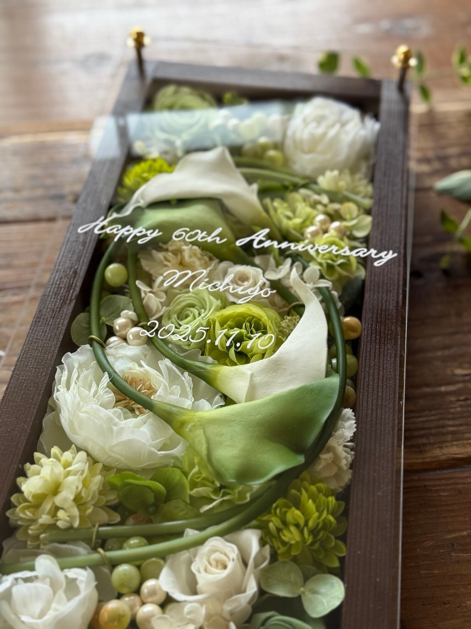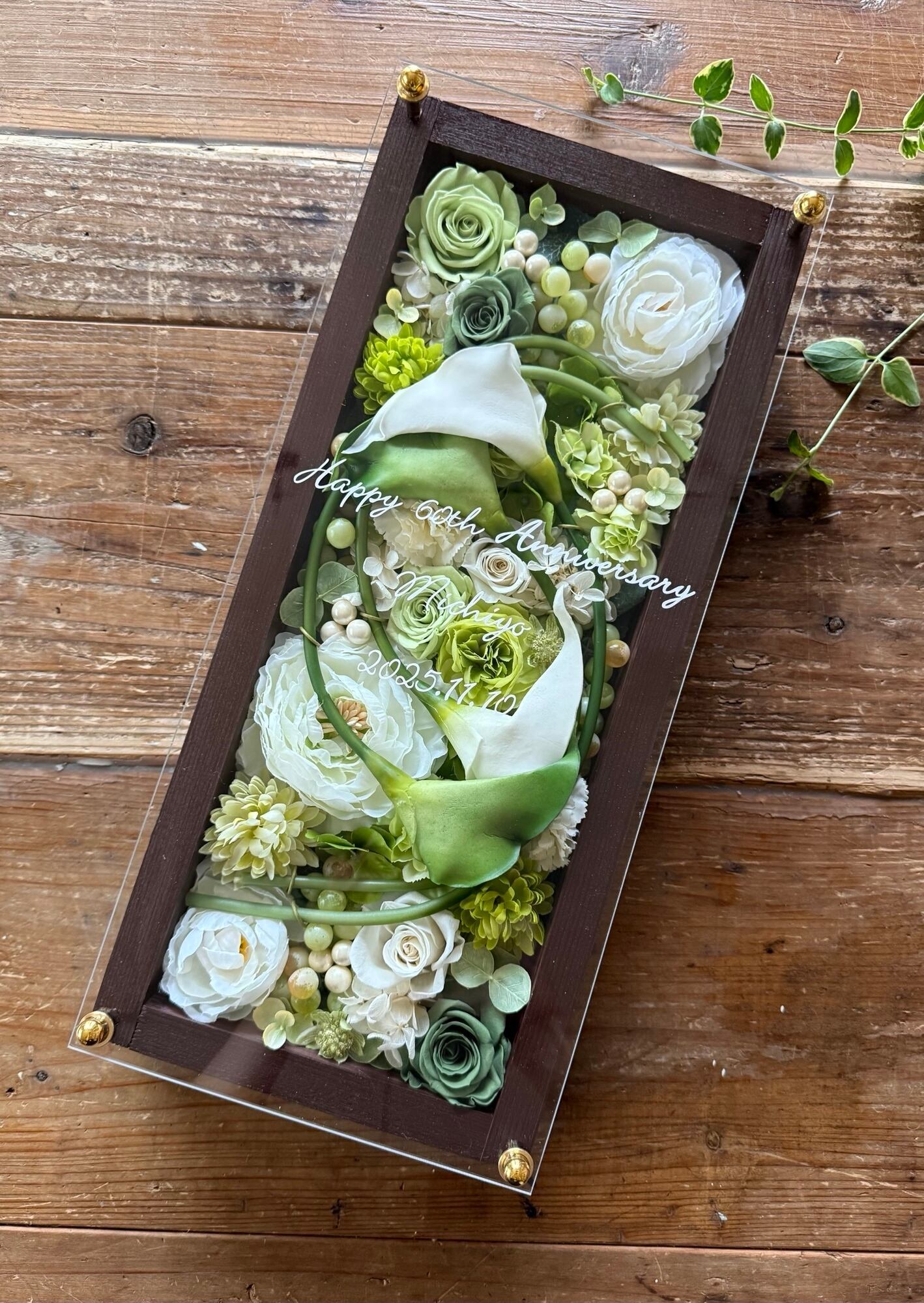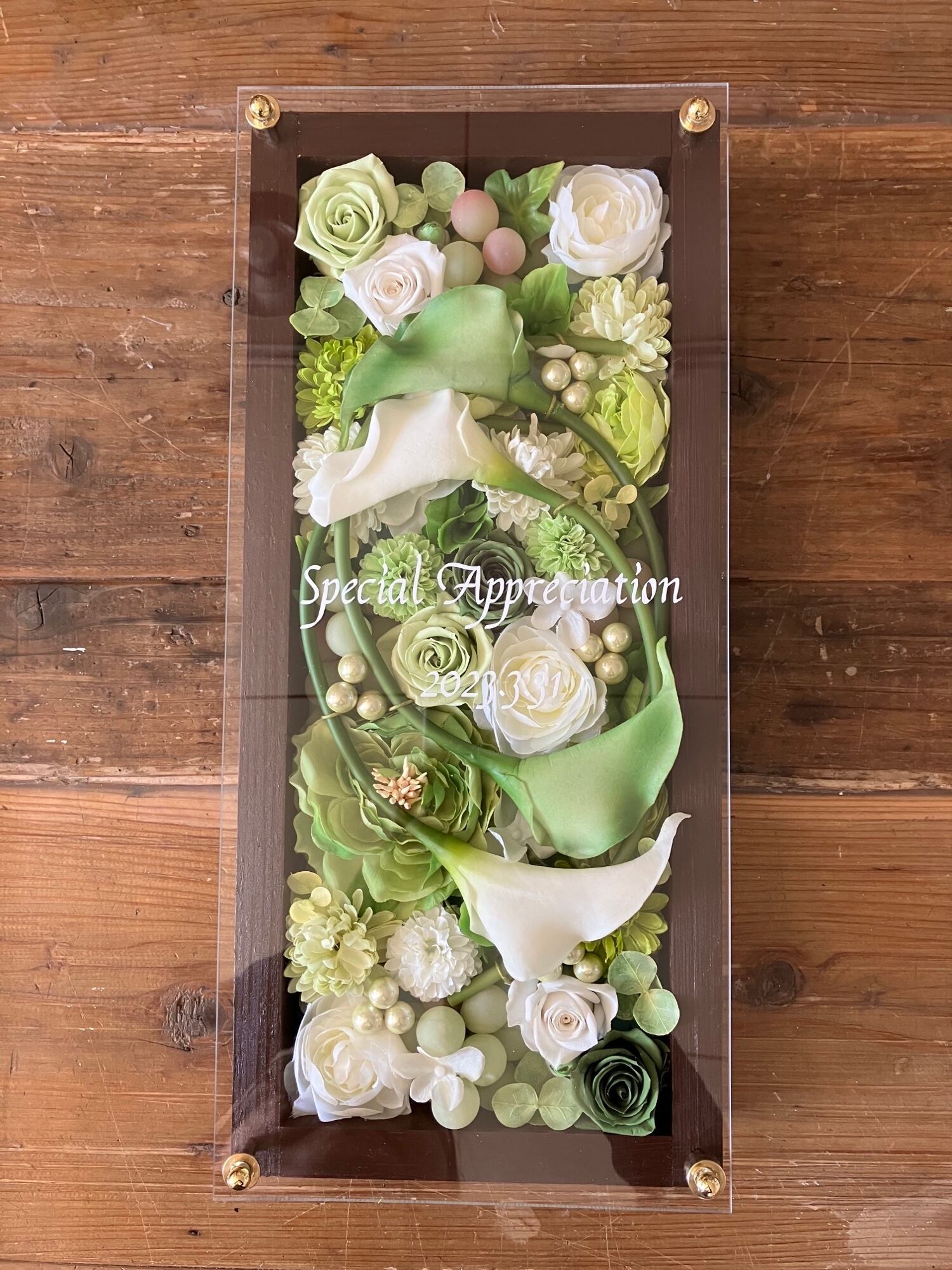 ロングサイズのウッドフレームにプリザーブドフラワーと造花をぎっしり詰め込みアクリル板にはカッティングシートでメッセージをお入れします。