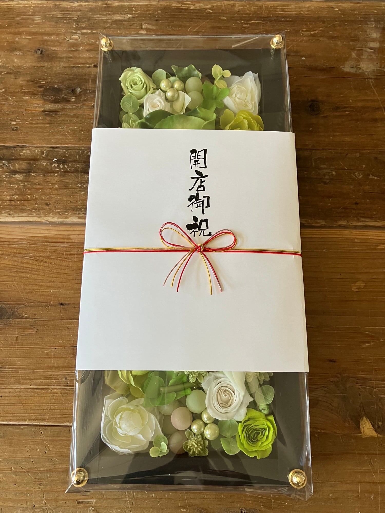 新築祝い・結婚祝い・開店祝い【名入れ】プリザーブドフラワーアレンジ 木枠ロング〈白グリーン〉