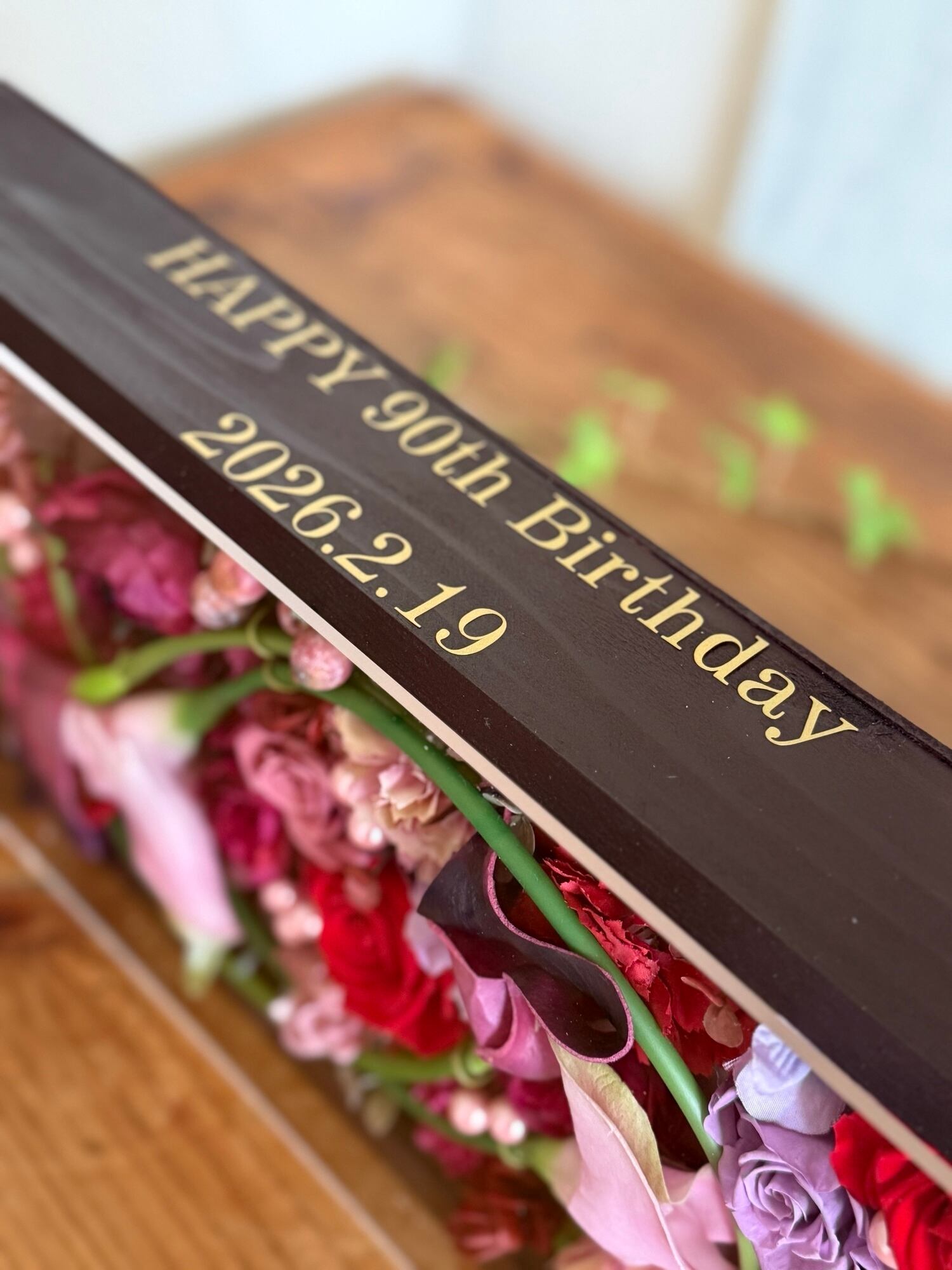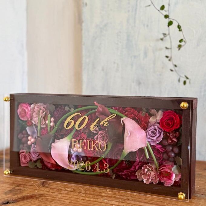 ロングサイズのウッドフレームにプリザーブドフラワーと造花をぎっしり詰め込み、アクリル板にはカッティングシートでメッセージをお入れします(木枠にも文字入れ可能)