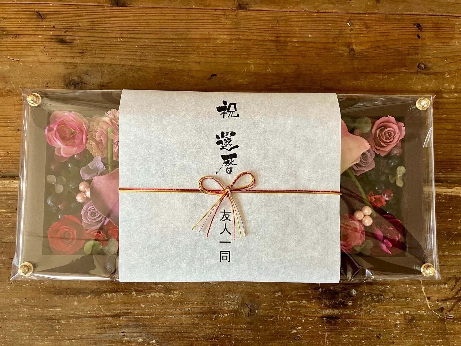 還暦祝い・米寿祝い・卒寿祝い【名入れ】プリザーブドフラワーアレンジ ウッドフレーム 木枠横置き〈ボルドー〉
