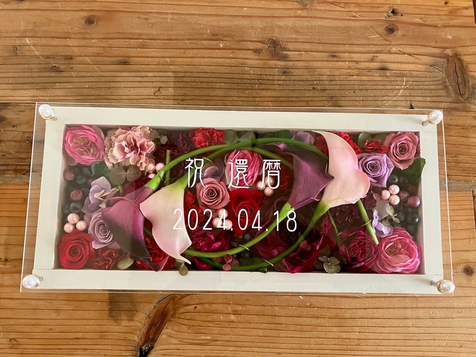 白色のロングサイズのウッドフレームにプリザーブドフラワーと造花をぎっしり詰め込みアクリル板にはカッティングシートでメッセージをお入れします。