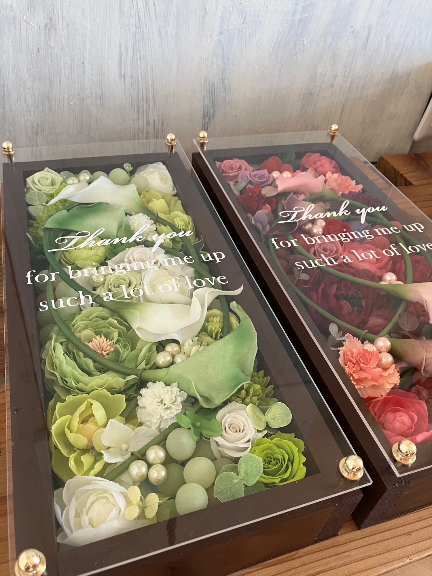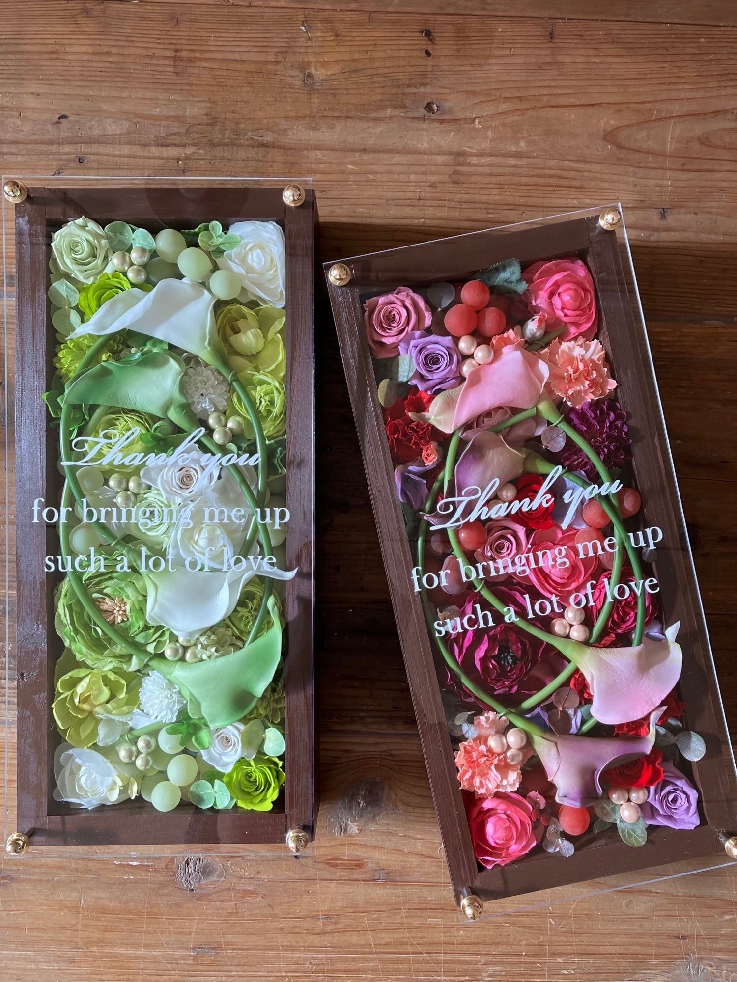 子育て感謝状・両親贈呈品 2個セット【名入れ】プリザーブドフラワーアレンジ ウッドフレーム ロング木枠〈ボルドー&白グリーン〉結婚式 ギフト