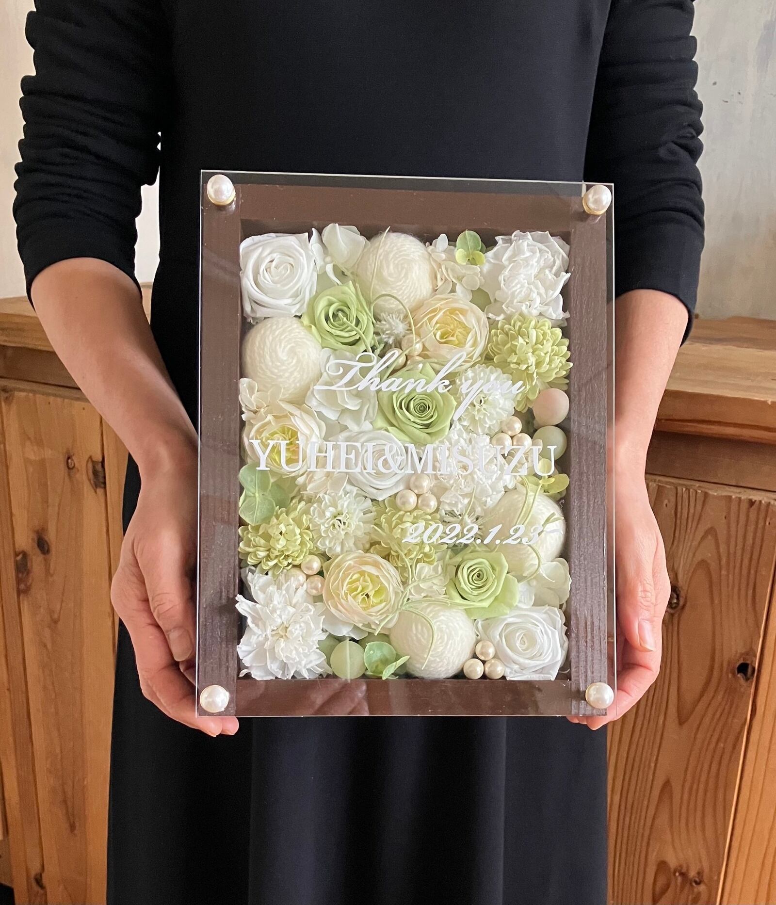 結婚祝い・開店祝い・サロンオープン祝い・お供え【名入れ】プリザーブドフラワーアレンジ ウッドフレーム 木枠〈白グリーン〉プライム