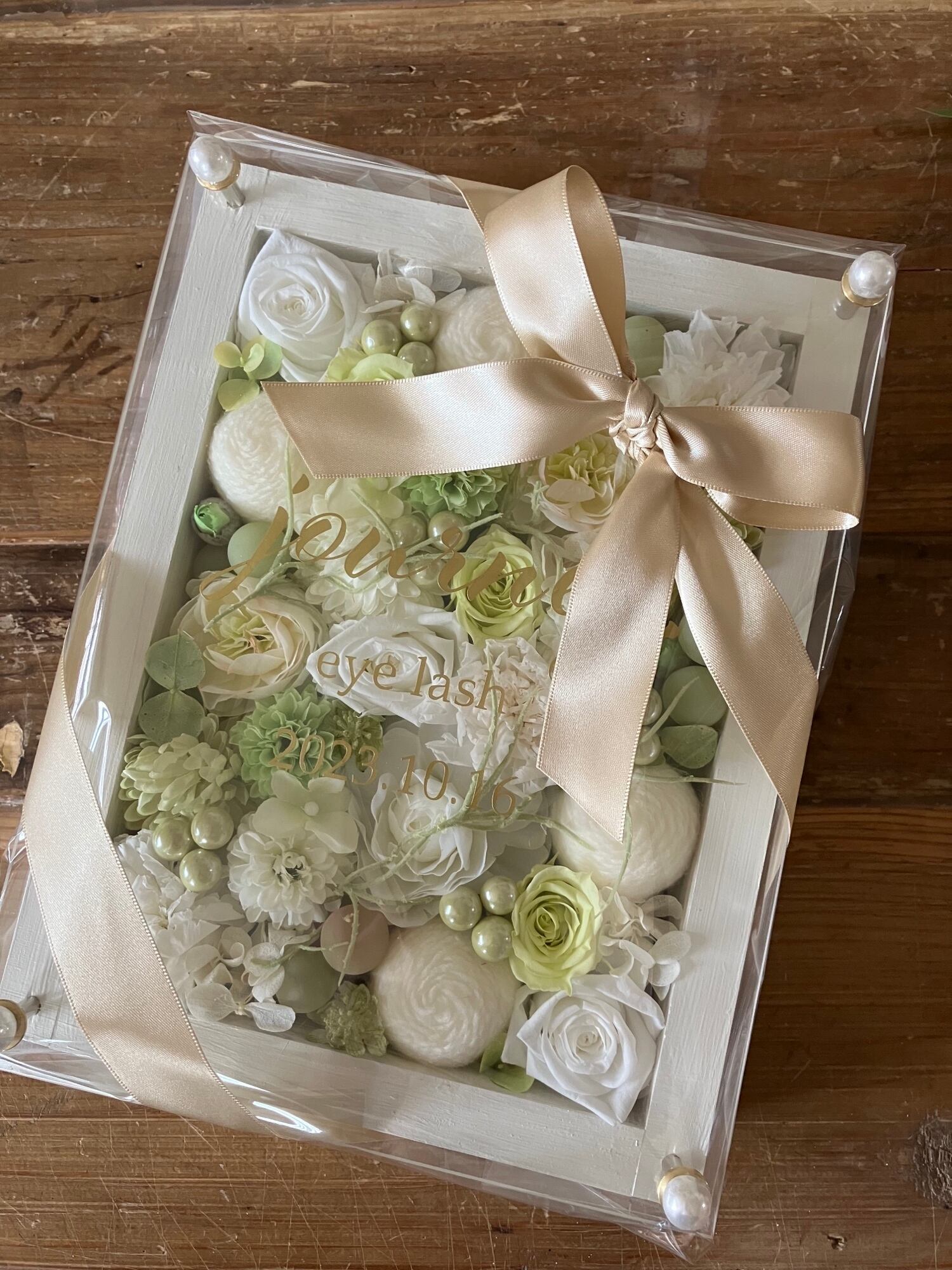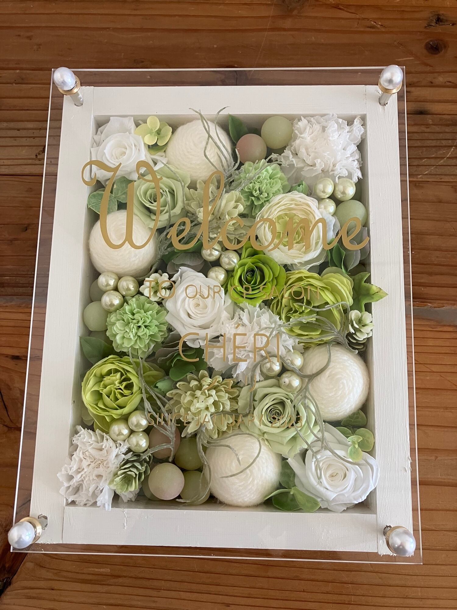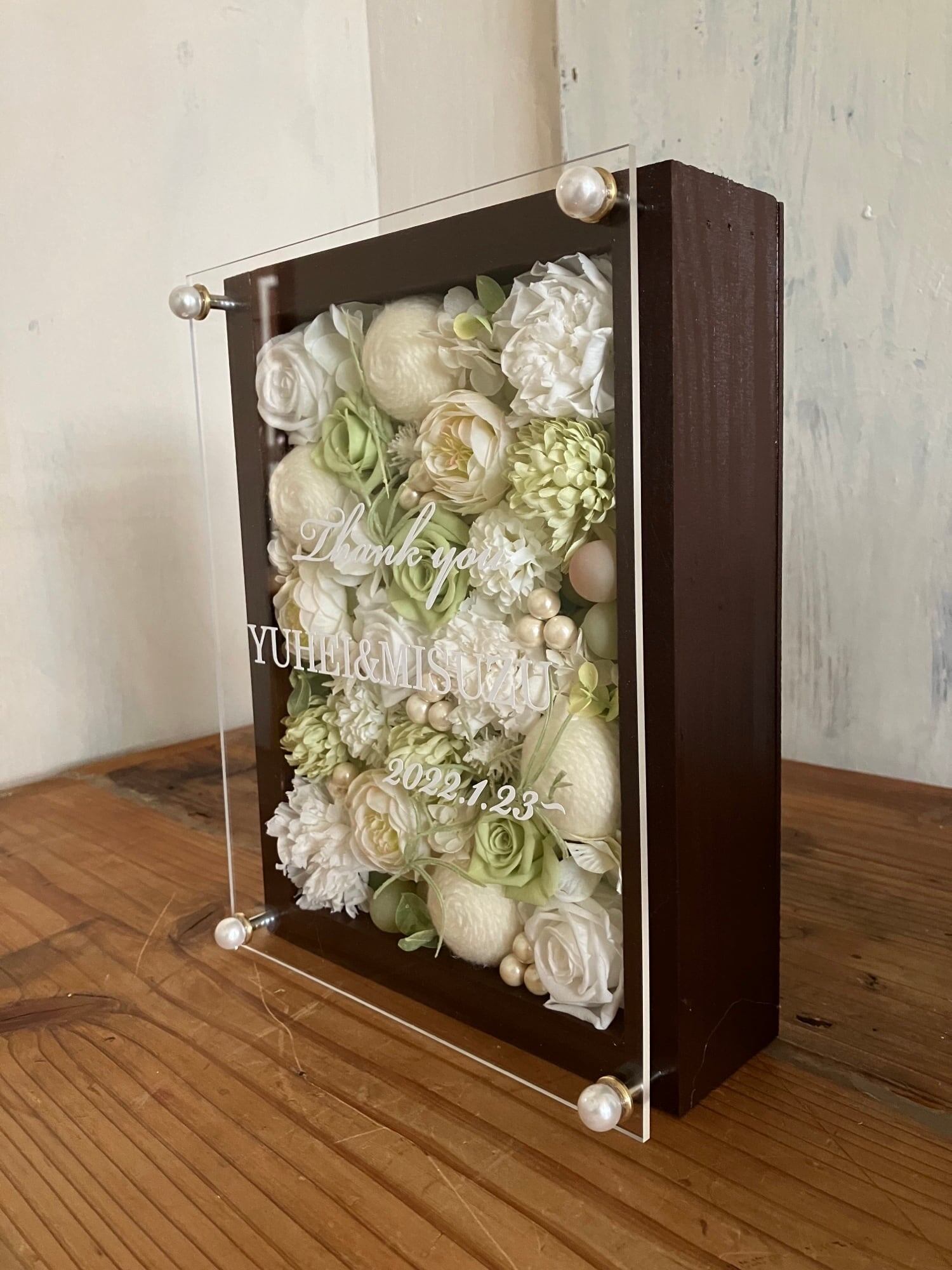 ウッドフレームにプリザーブドフラワーと造花をぎっしり詰め込みアクリル板にはカッティングシートでメッセージをお入れします。