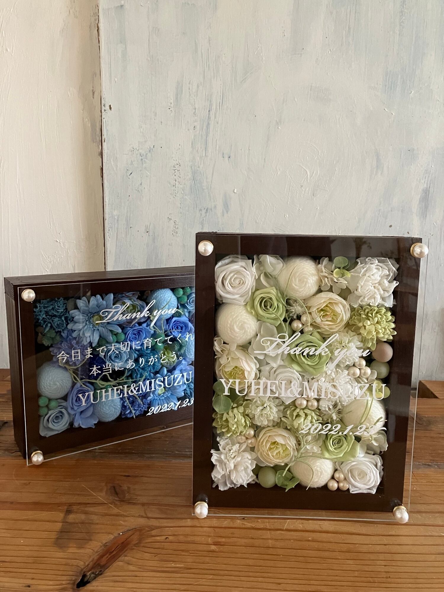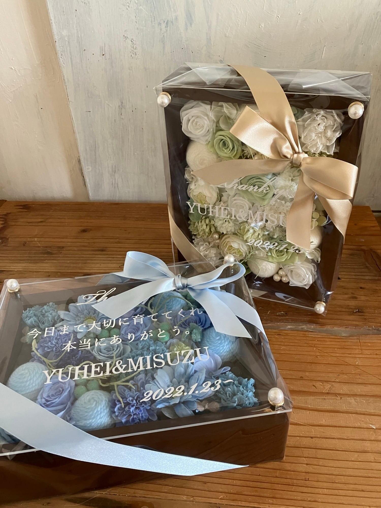 子育て感謝状・両親贈呈品 2個セット【名入れ】プリザーブドフラワーアレンジ ウッドフレーム 茶木枠〈ブルー&白グリーン〉結婚式 ギフト プライム