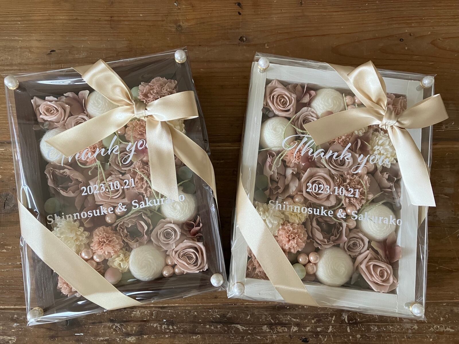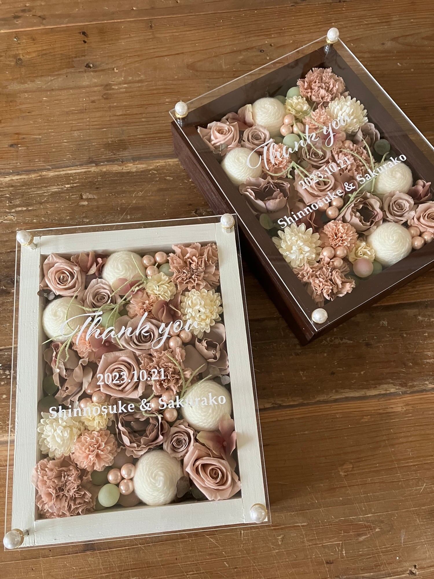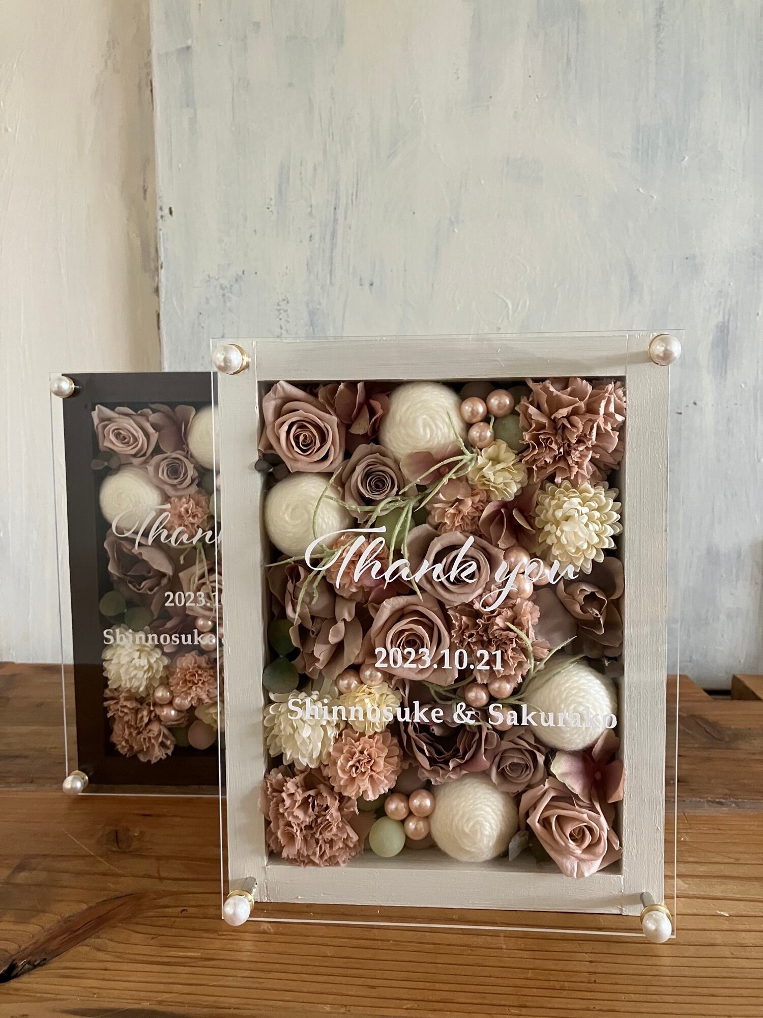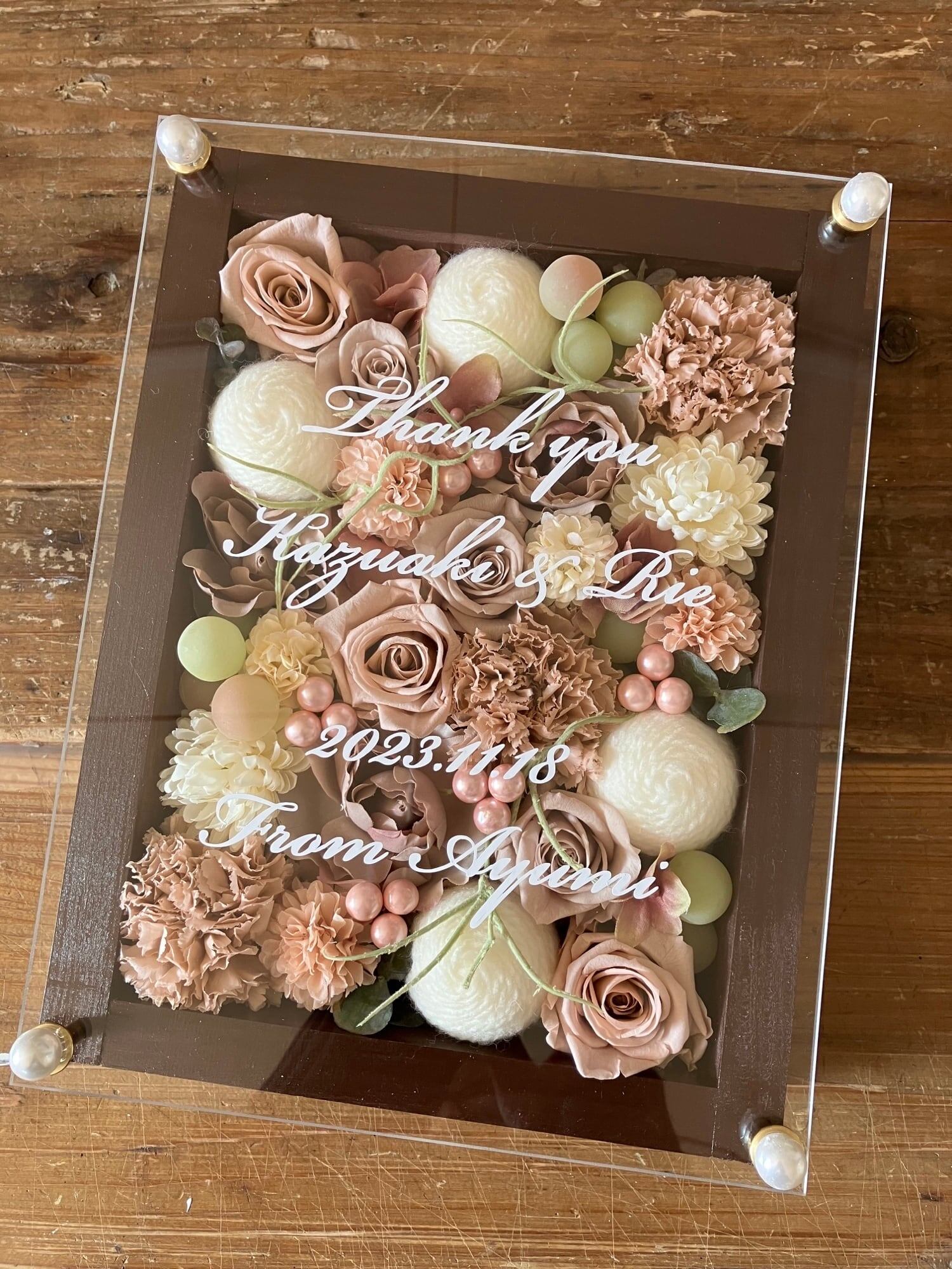 ウッドフレームにプリザーブドフラワーと造花をぎっしり詰め込み、アクリル板にはカッティングシートで名前、挙式日、生まれてから今日までの日数などをお入れします