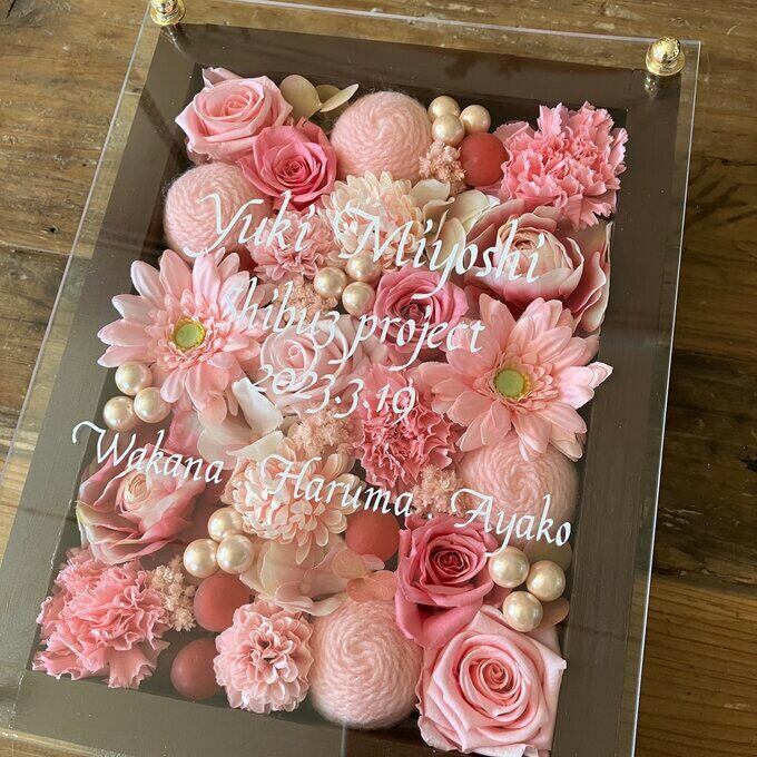 ウッドフレームにプリザーブドフラワーと造花をぎっしり詰め込みアクリル板にはカッティングシートでメッセージをお入れします。