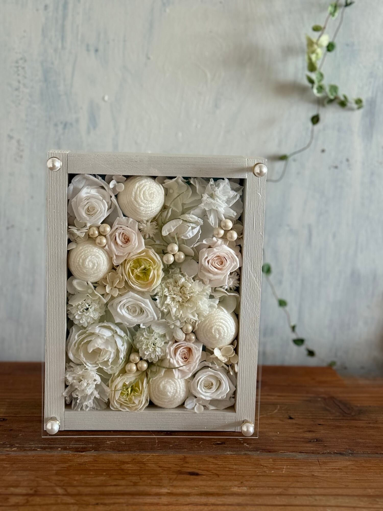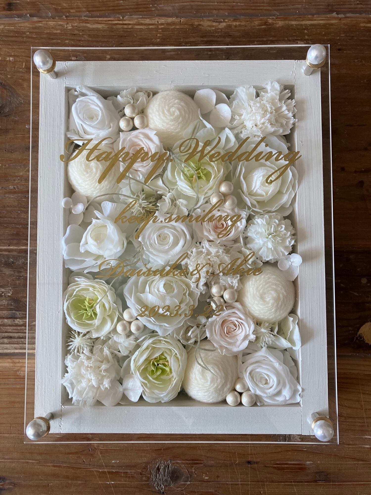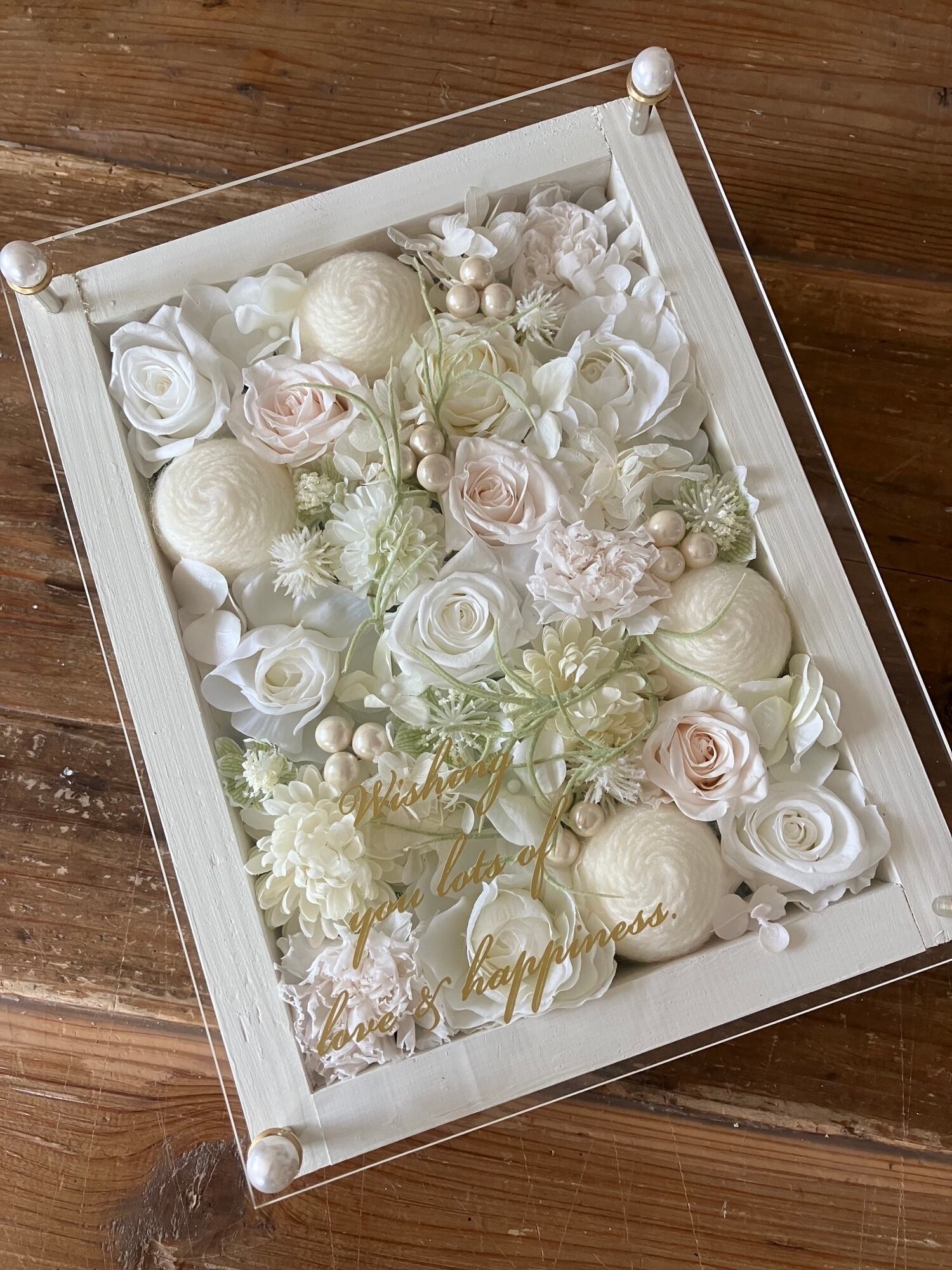 ウッドフレームにプリザーブドフラワーと造花をぎっしり詰め込み、アクリル板にはカッティングシートでメッセージをお入れします。