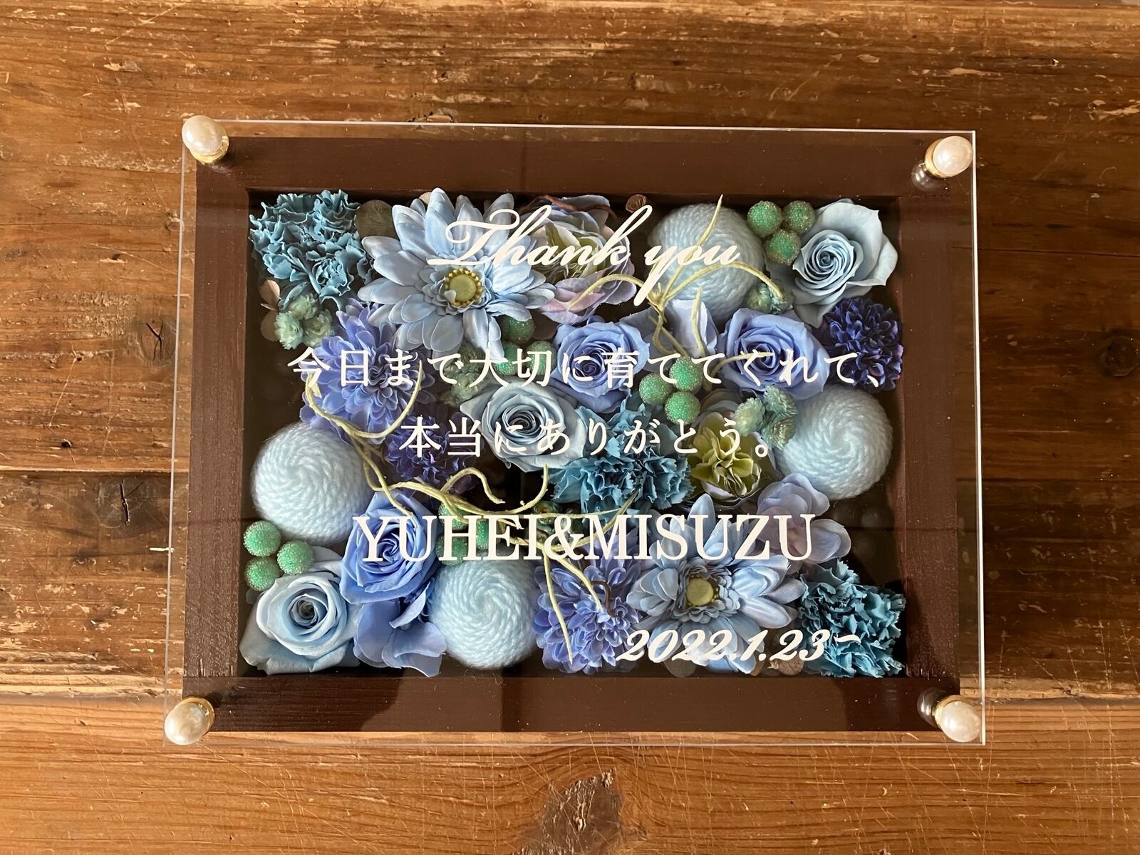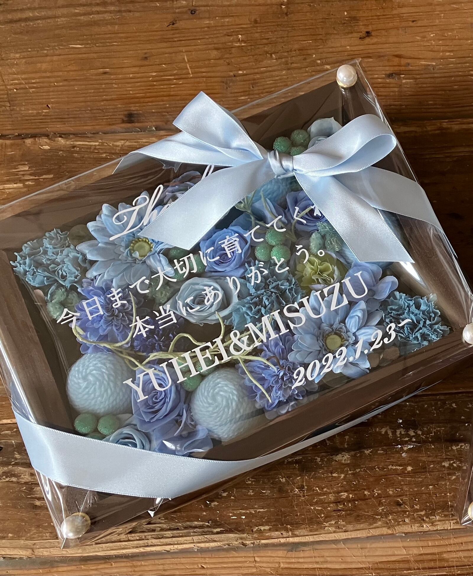 ウッドフレームにプリザーブドフラワーと造花をぎっしり詰め込みアクリル板にはカッティングシートでメッセージをお入れします。