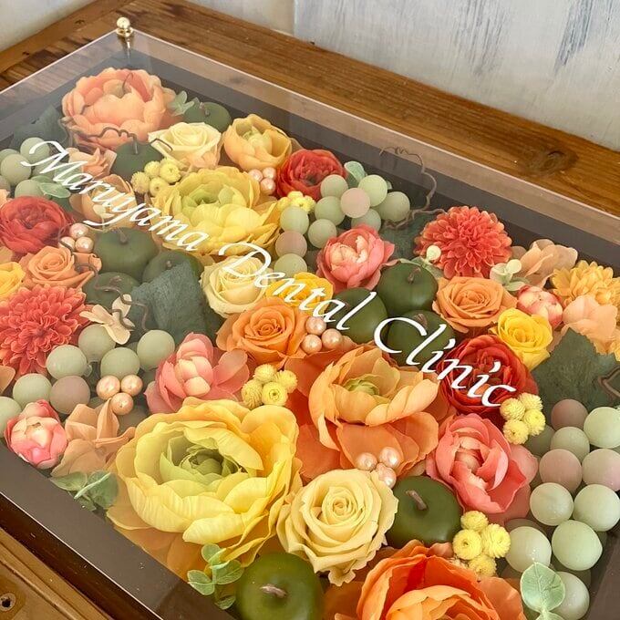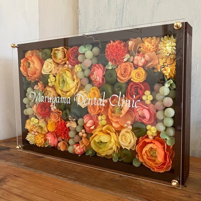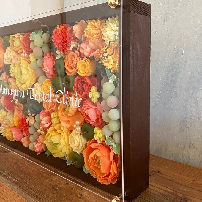 開院祝い・クリニックオープン祝い・開業祝い【名入れ】プリザーブドフラワーアレンジウッドフレーム 大きい木枠 お花いっぱい〈イエローオレンジ〉