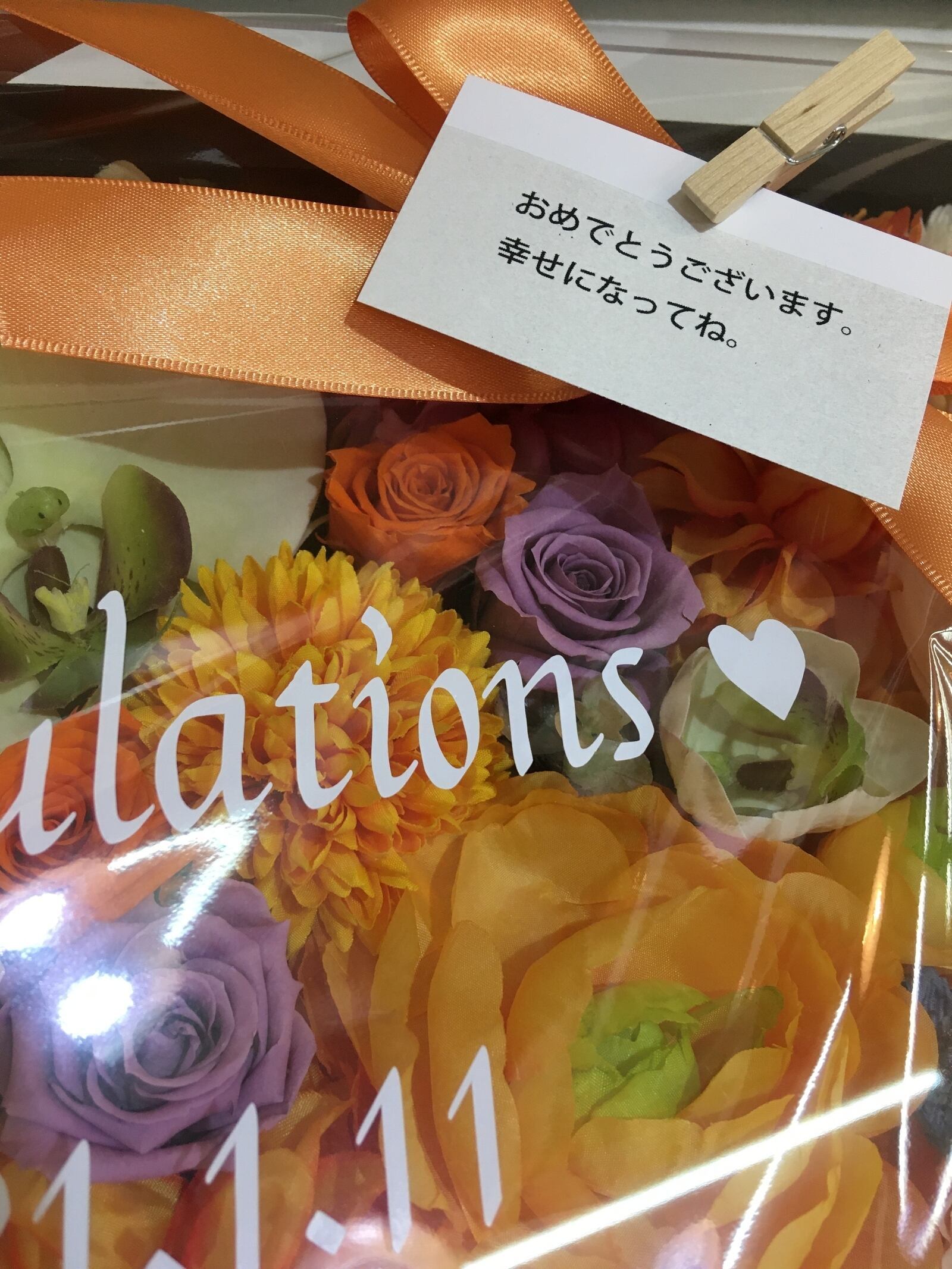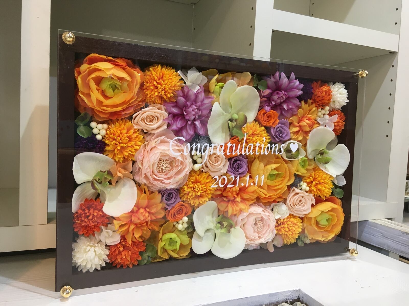 ウッドフレームにプリザーブドフラワーと造花をぎっしり詰め込みアクリル板にはカッティングシートでメッセージをお入れします。