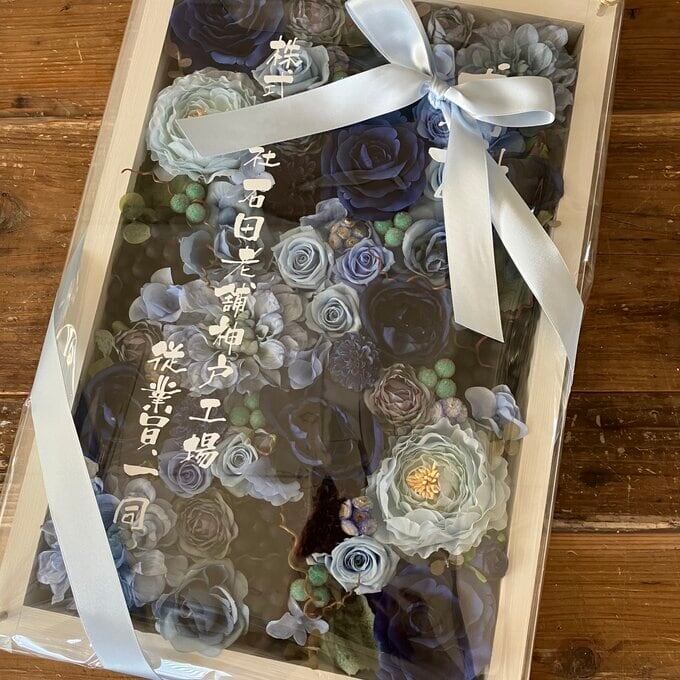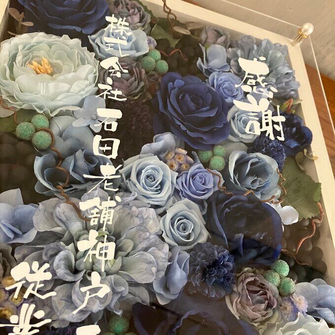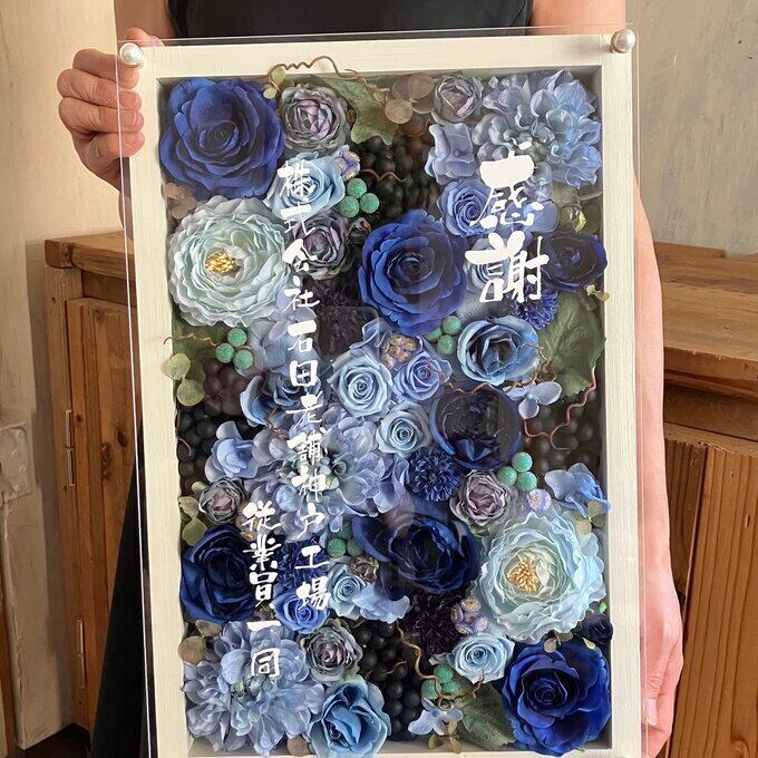記念品・退職祝い・結婚祝い・結婚式ウェルカムボード【名入れ】プリザーブドフラワーアレンジ ウッドフレーム 大きいフレーム お花いっぱい〈ブルー〉