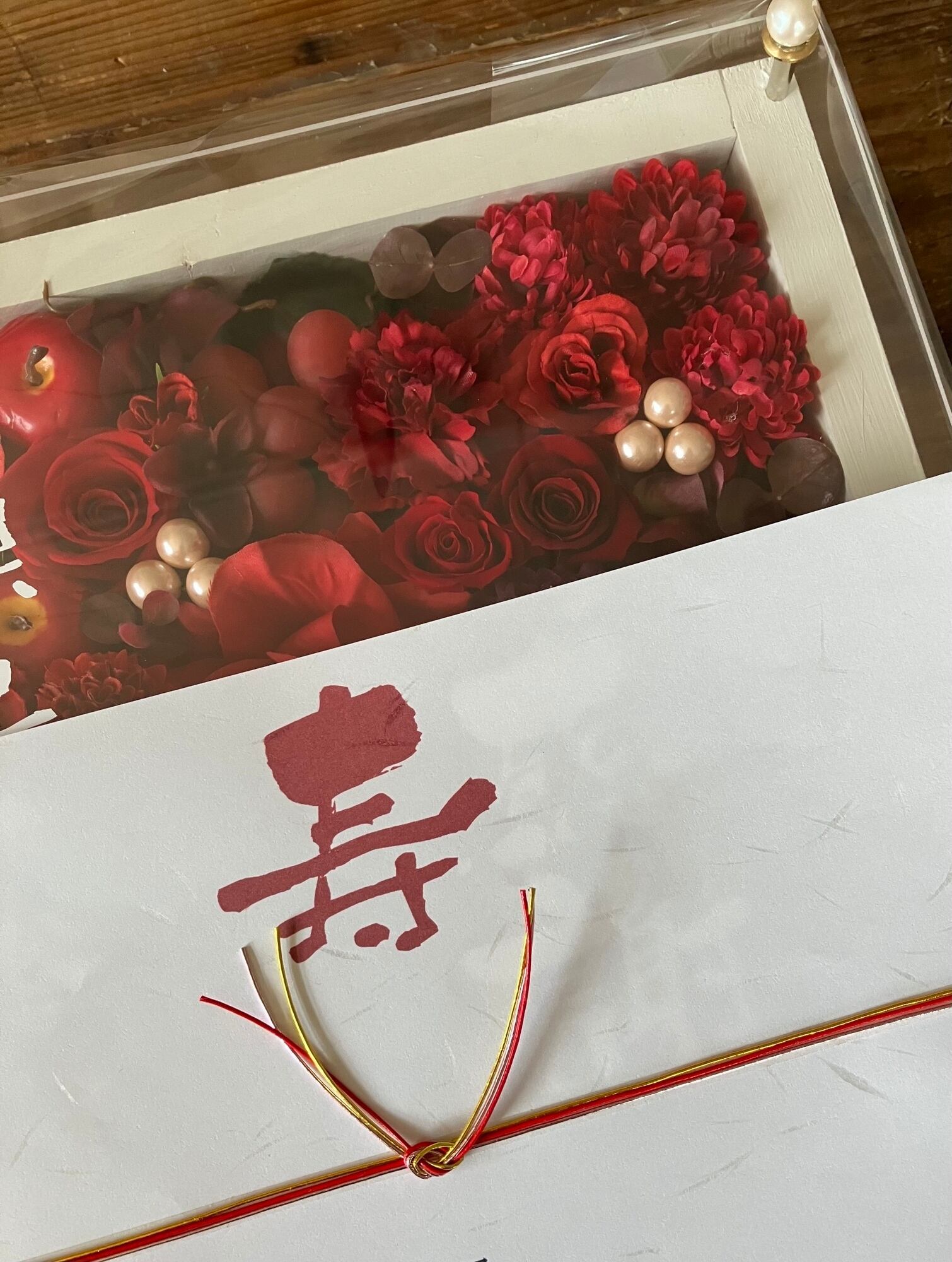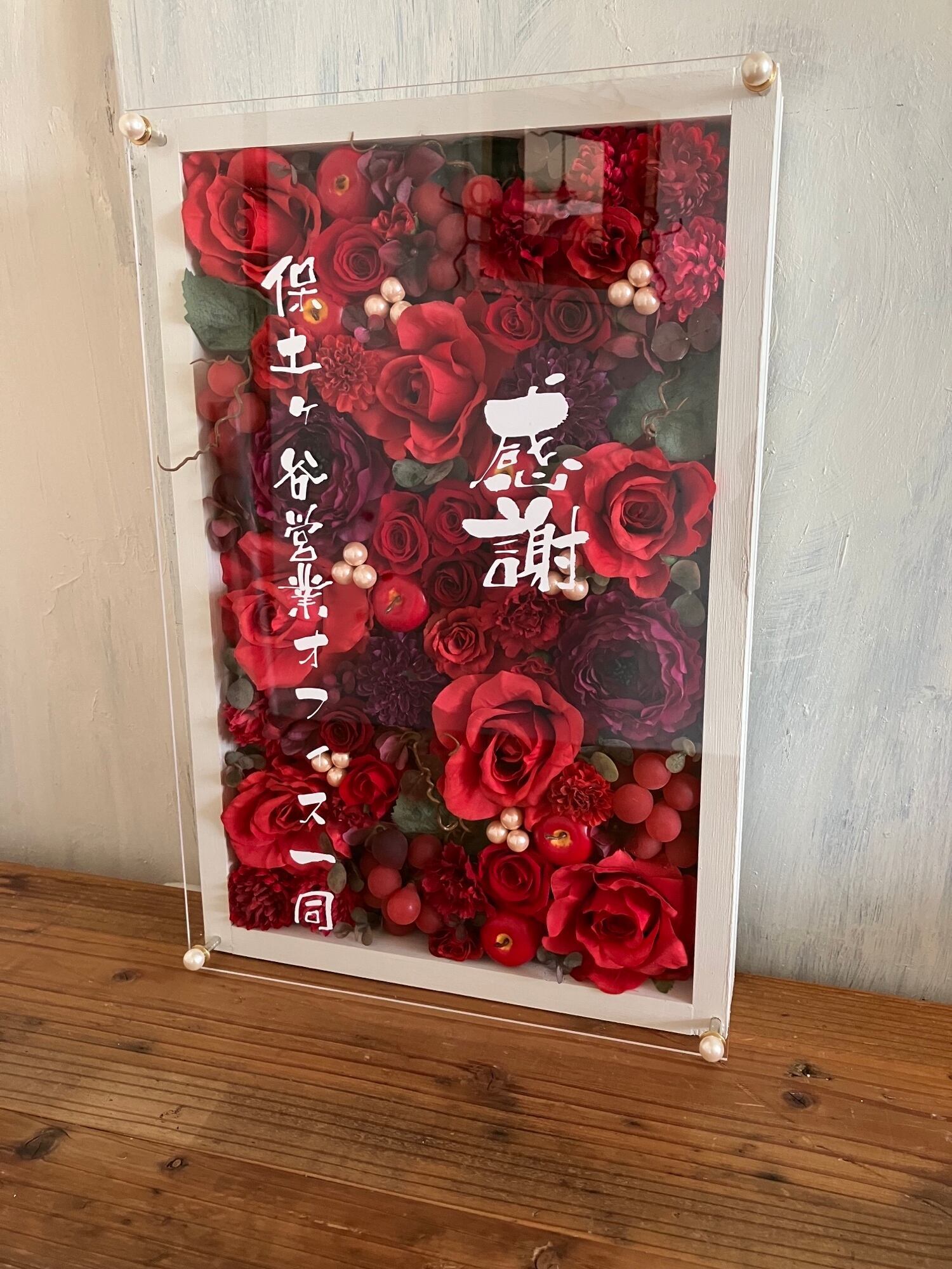ウッドフレームにプリザーブドフラワーと造花をぎっしり詰め込みアクリル板にはカッティングシートでメッセージをお入れします。