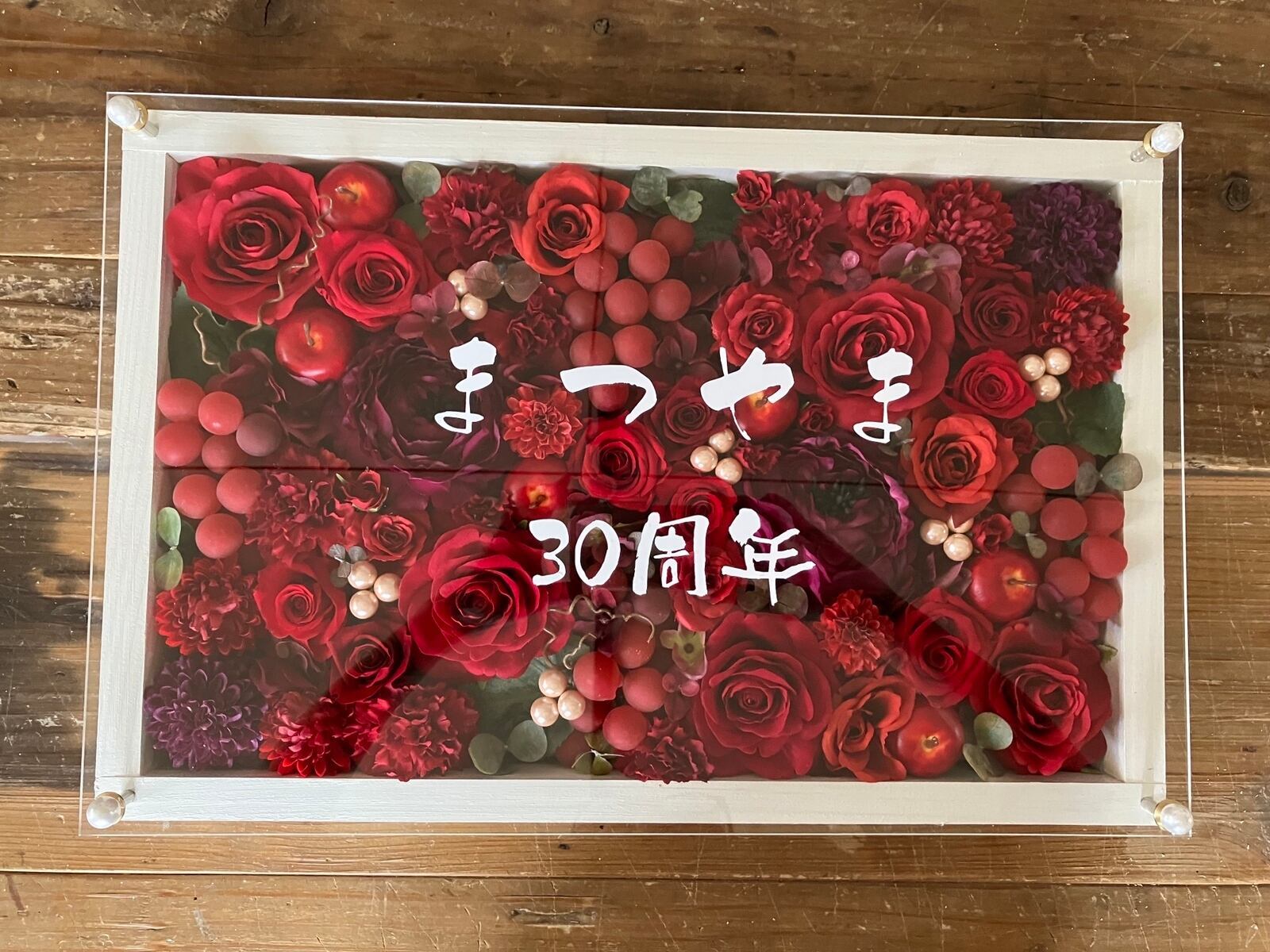 記念品・ 周年祝い・還暦祝い【名入れ】プリザーブドフラワーアレンジ ウッドフレーム 大きい木枠 お花いっぱい〈レッド〉