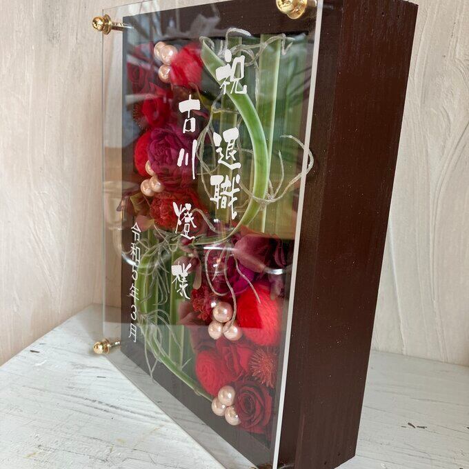 茶色のウッドフレームにプリザーブドフラワーと造花をバランスよく詰め込みアクリル板にはカッティングシートでメッセージをお入れします。