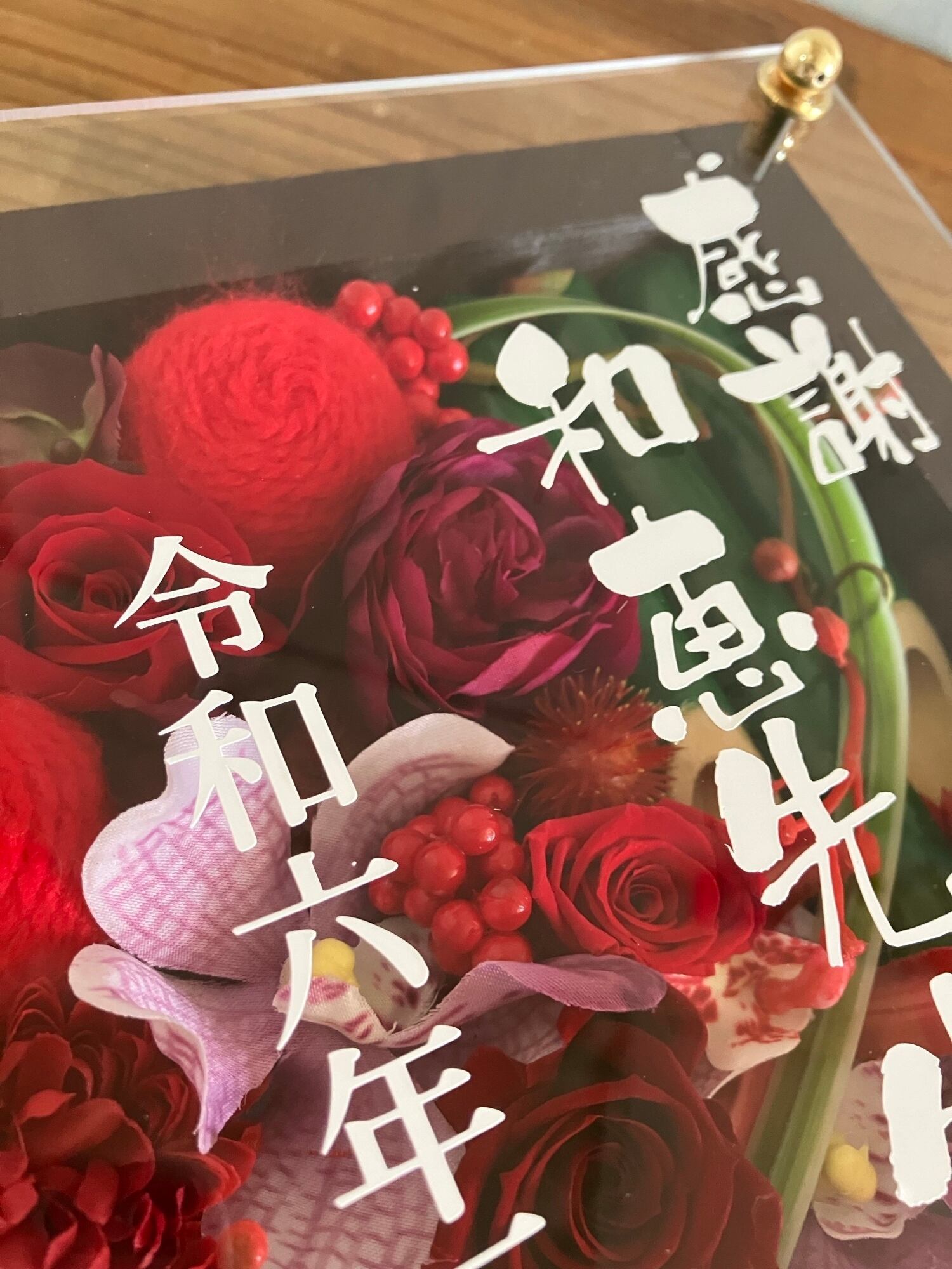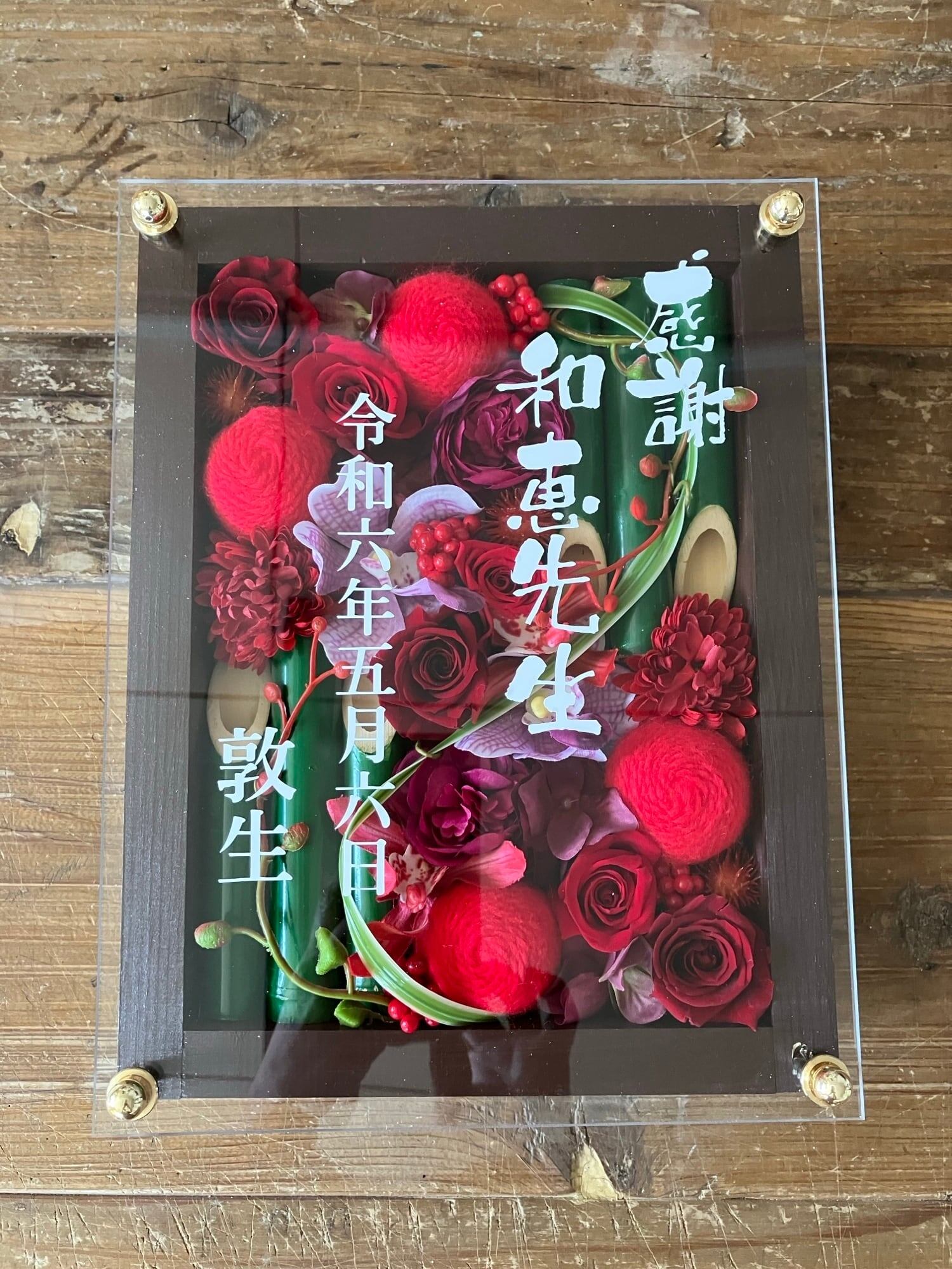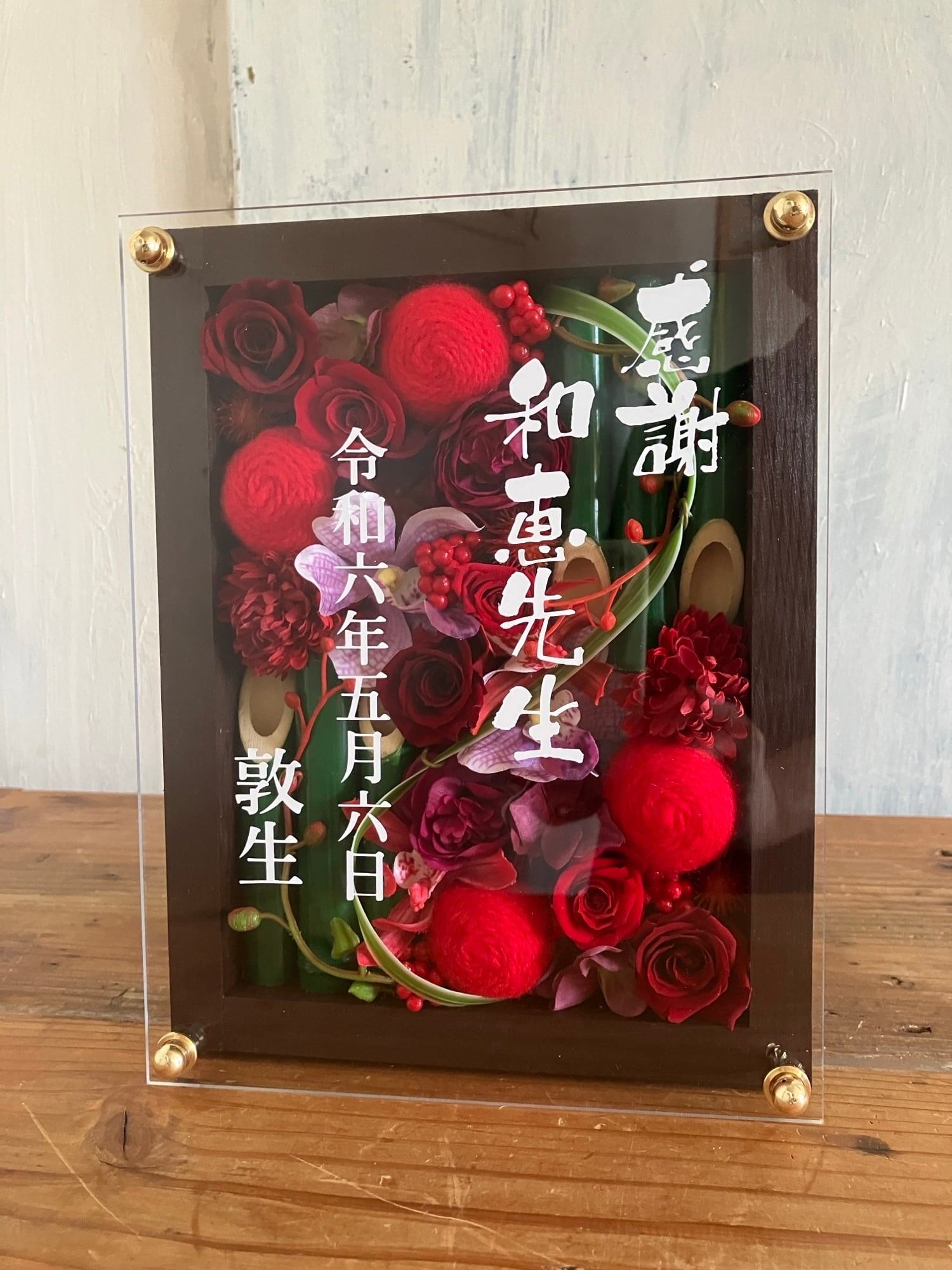 ウッドフレームにプリザーブドフラワーと造花をバランスよく詰め込み、アクリル板にはカッティングシートでメッセージをお入れします。