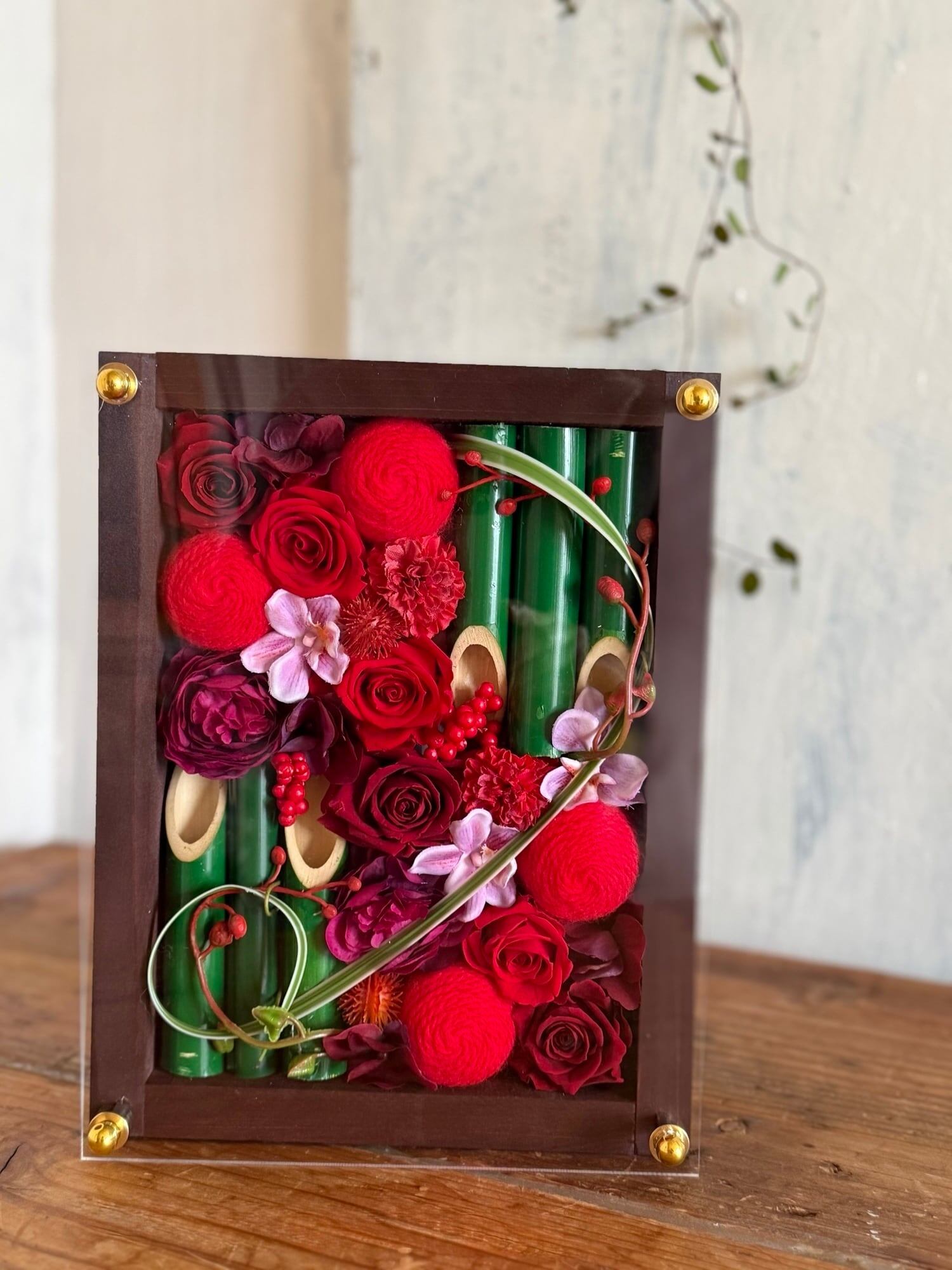 還暦祝い・退職祝い【名入れ】プリザーブドフラワーアレンジ ウッドフレーム 竹 茶木枠〈赤〉