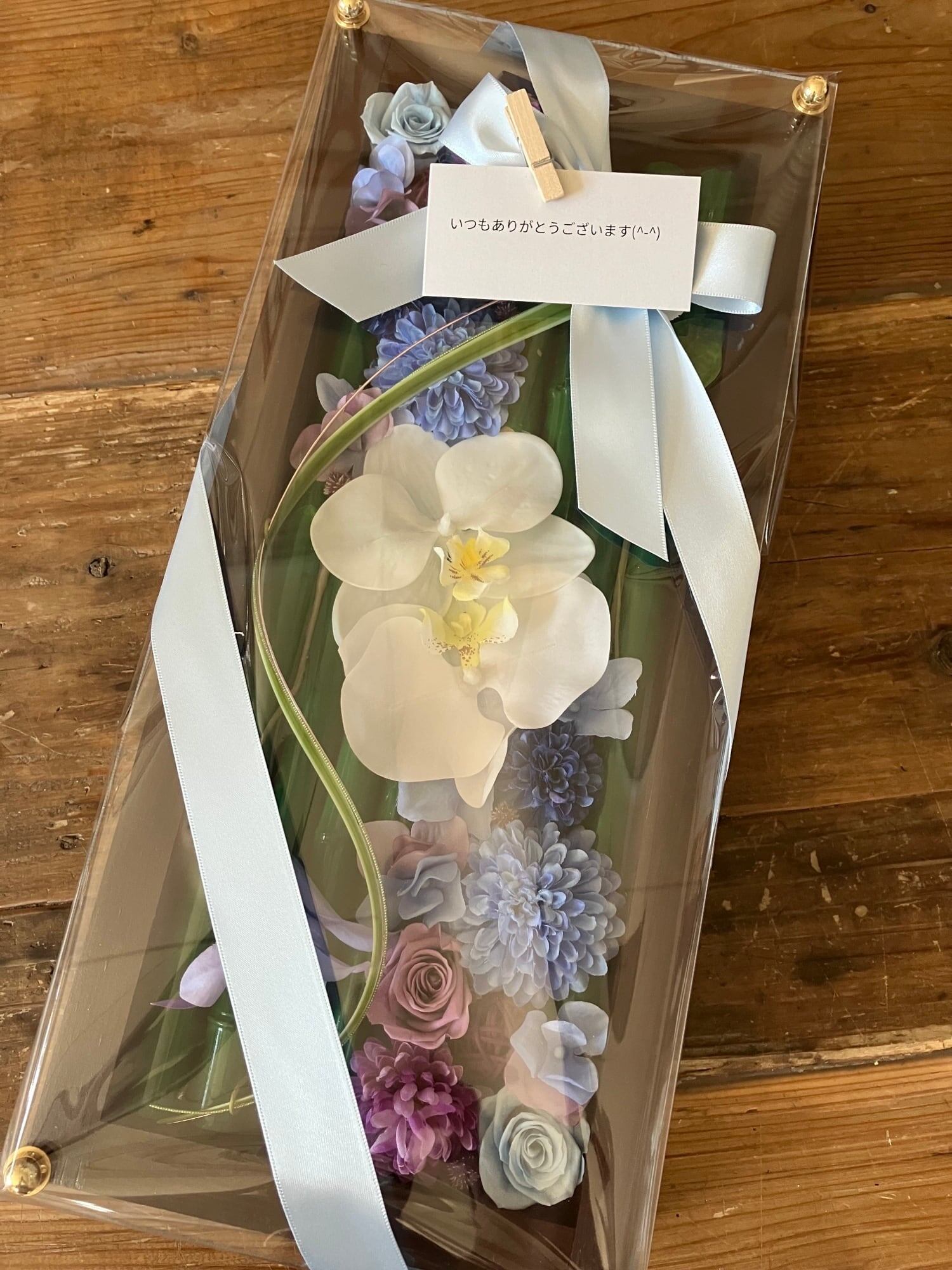 ロングサイズのウッドフレームに竹とプリザーブドフラワーと造花をバランスよく詰め込みアクリル板にはカッティングシートでメッセージをお入れします。