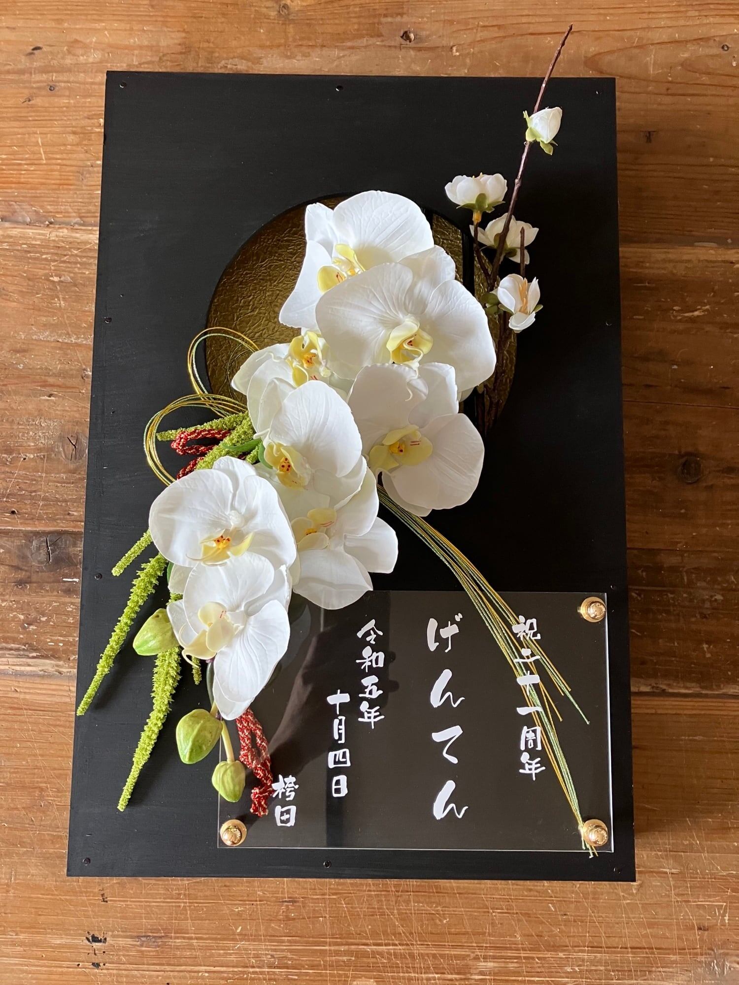 開店祝い・周年祝い・結婚祝い・和婚ウェルカムボード・還暦祝い【名入れ】 黒木枠窓〈和風 胡蝶蘭〉
