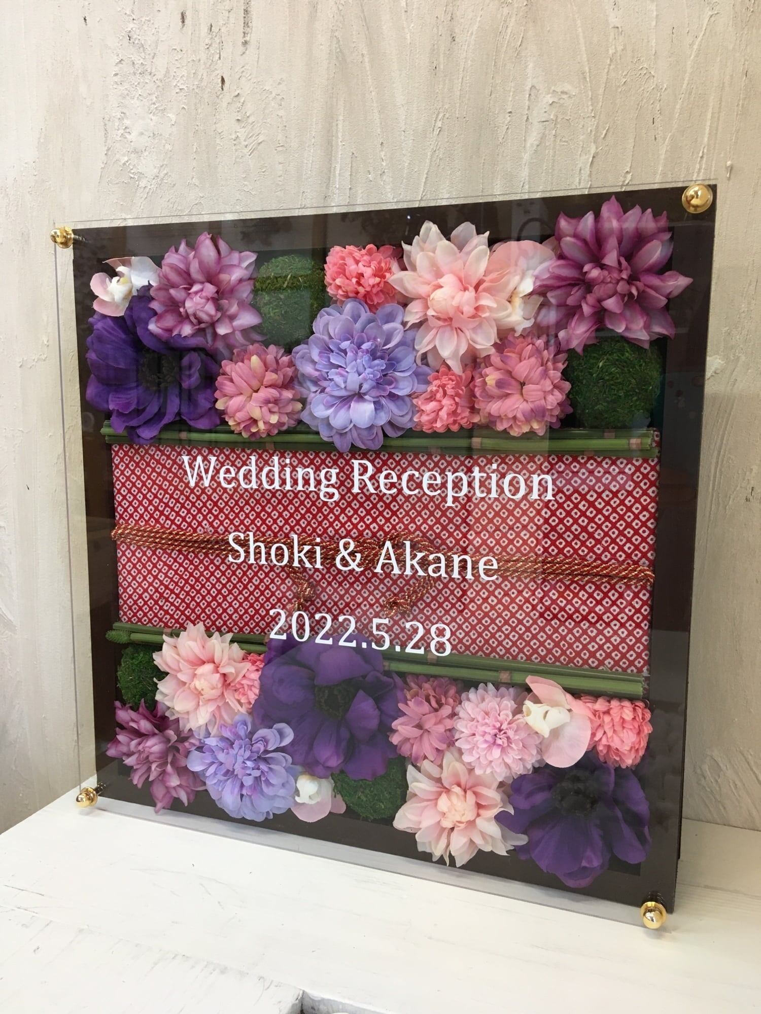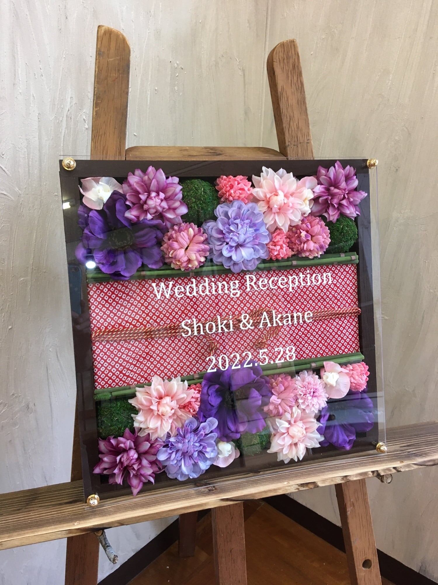 和風ウェルカムボード・開店祝い・周年祝い・結婚祝い・和婚ウェルカムボード【名入れ】ウッドフレーム 帯 茶木枠〈ピンク紫〉