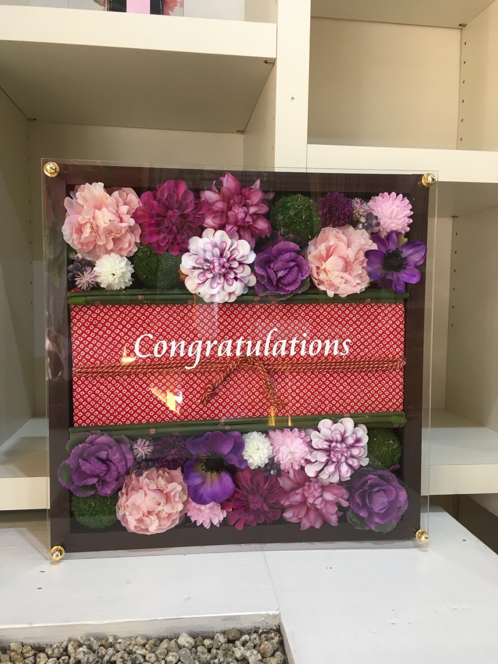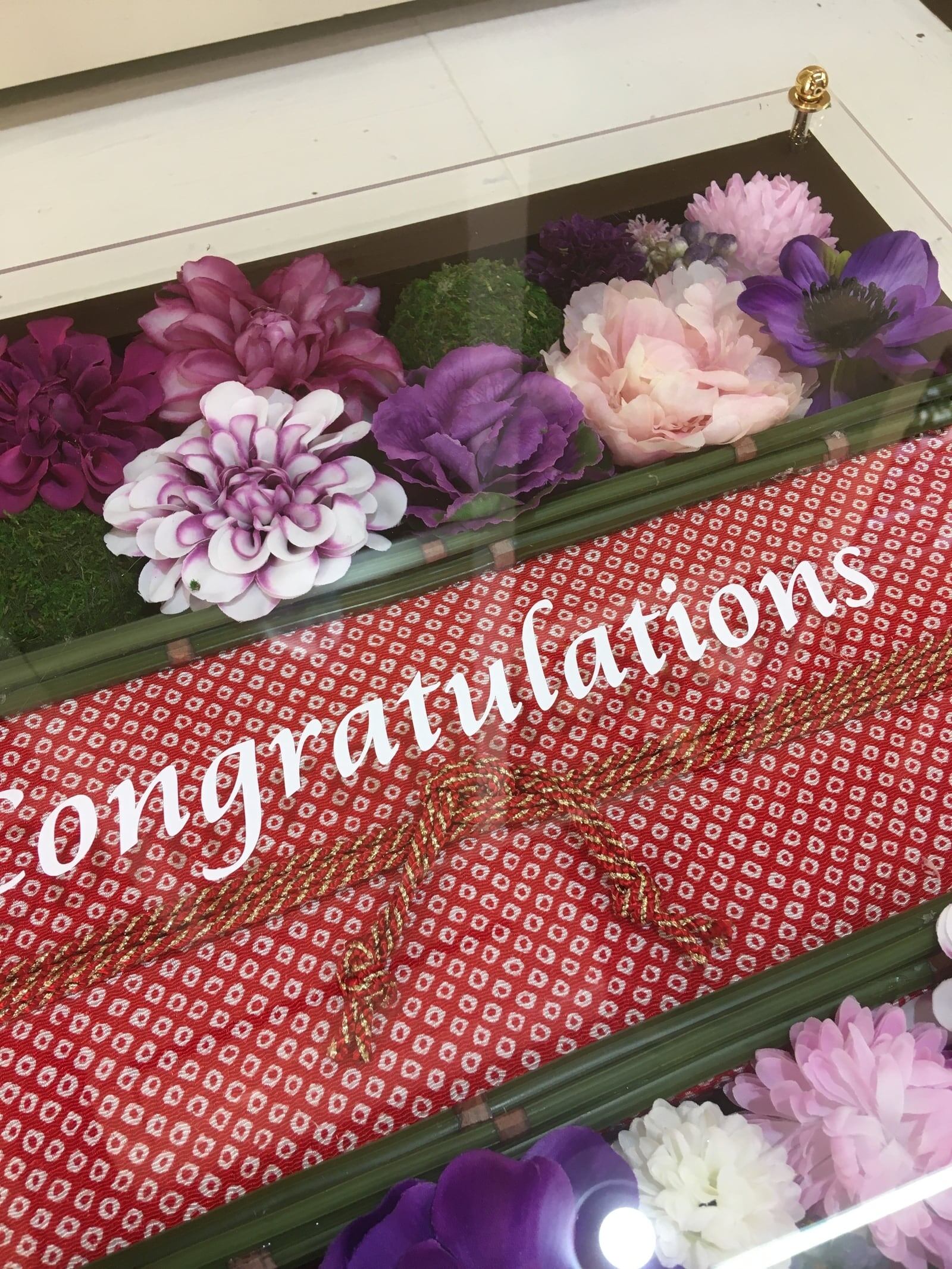 ちりめんの布を帯に見立てた名入れお花のフレーム