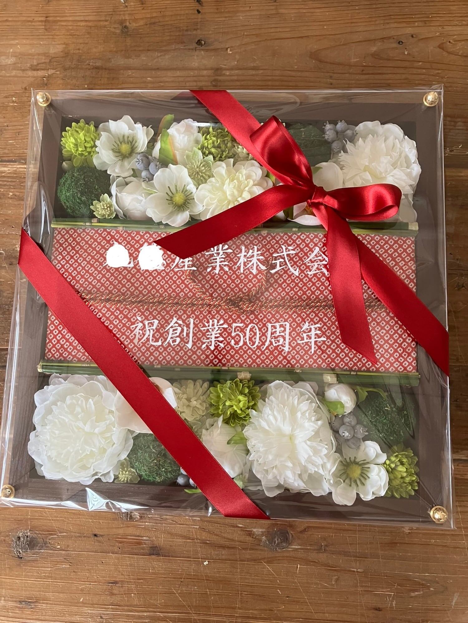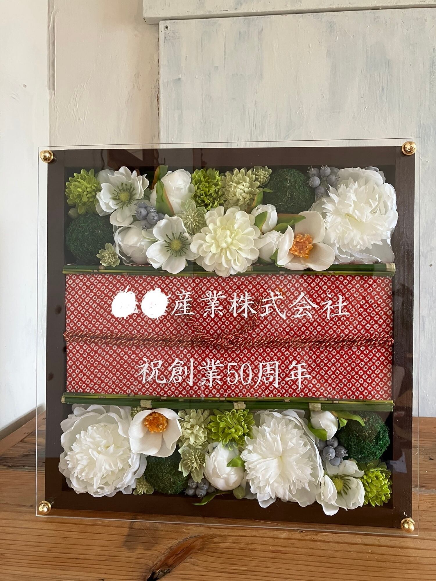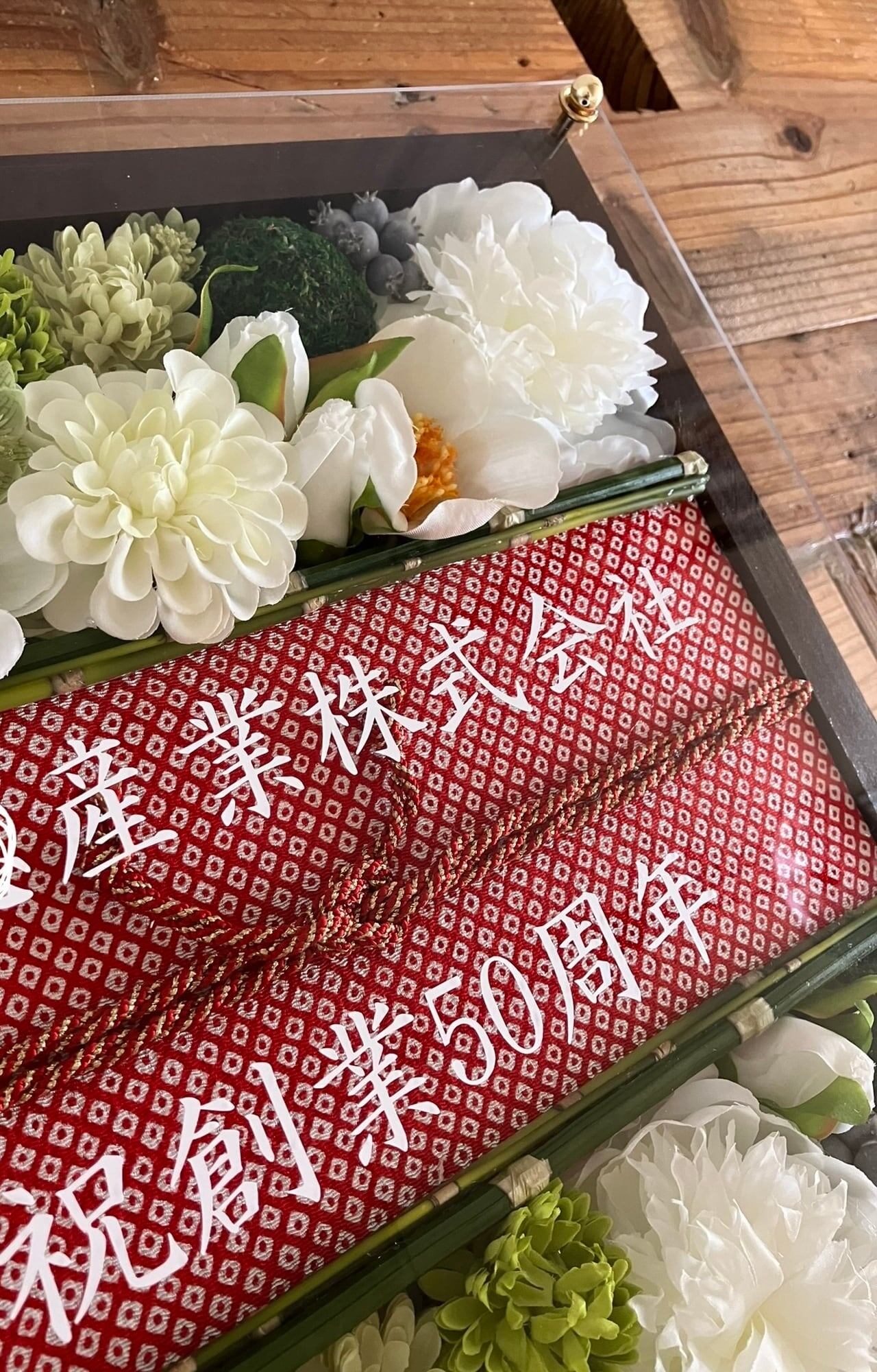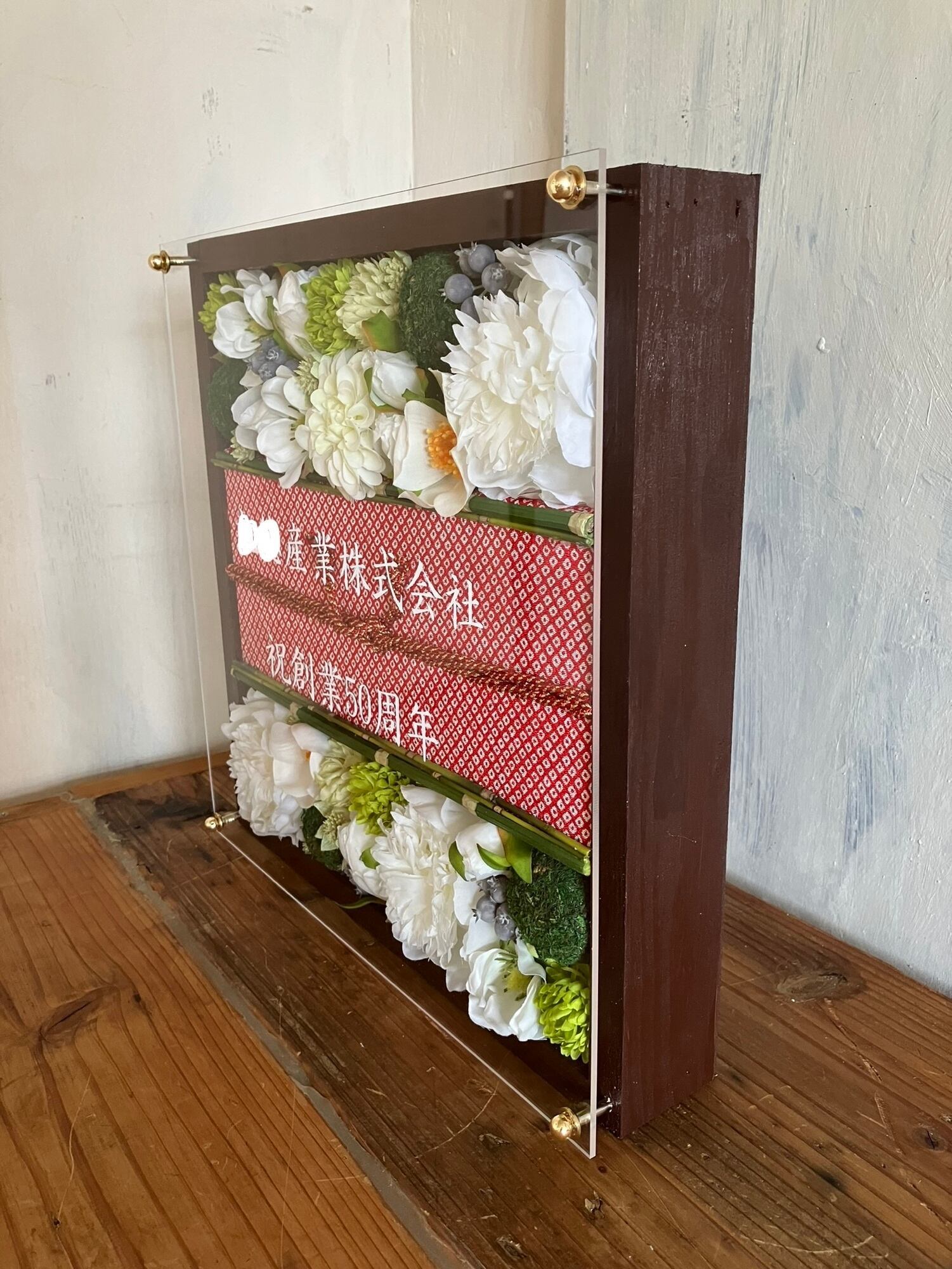 ちりめんの布を帯に見立てた名入れお花のフレーム