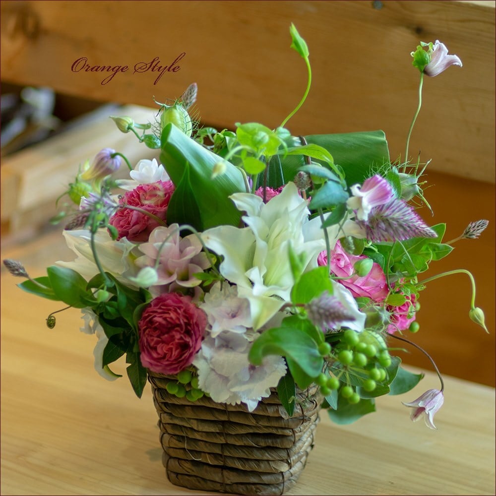 存在感のある飾りになる、季節の花々をたっぷり使ったナチュラルなフラワーアレンジです。